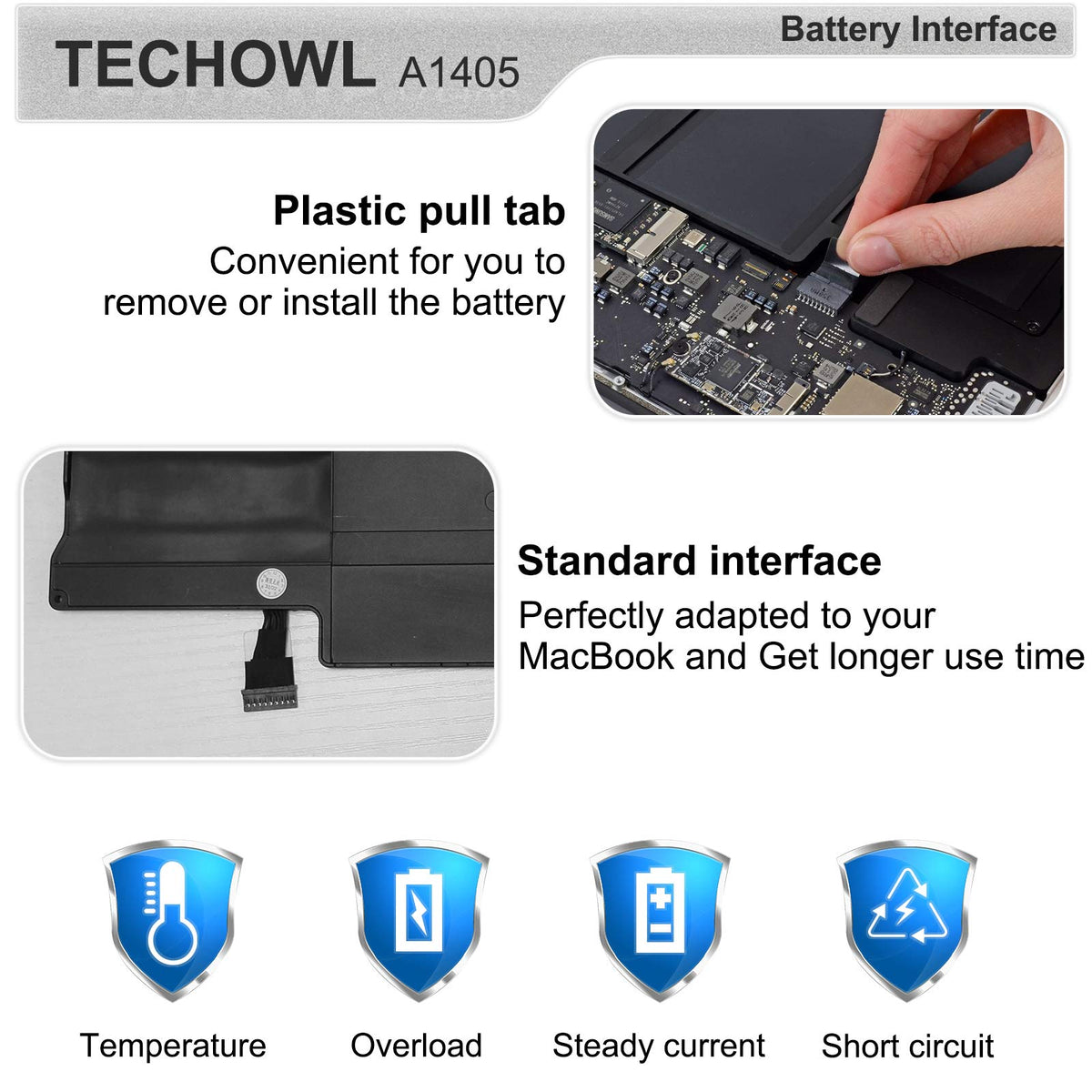 Techowl A1466 Battery A1405 A1496 Battery For Macbook Air Battery Replacement 13 Inch A1466 (2012 2017) A1369 (2010 2011) [7.6