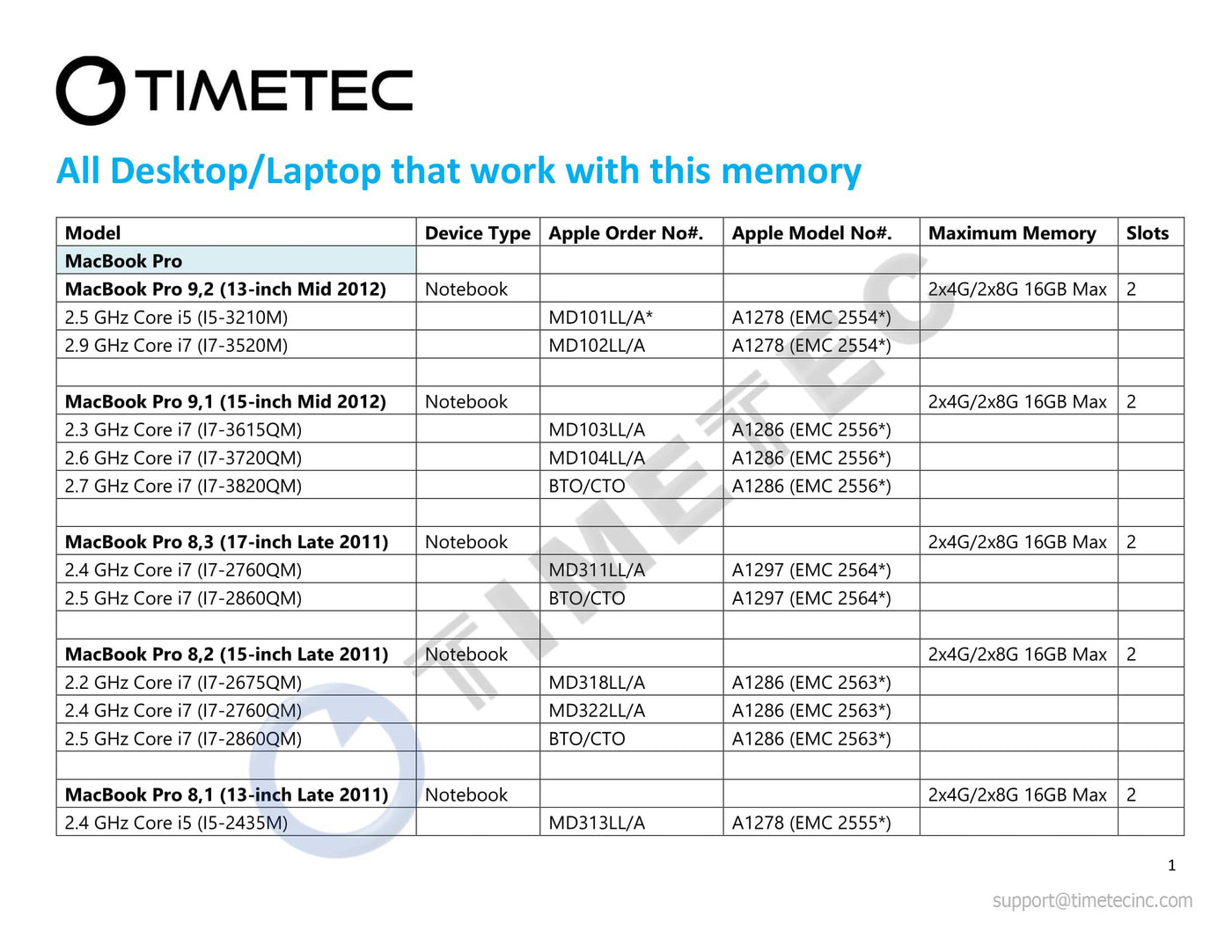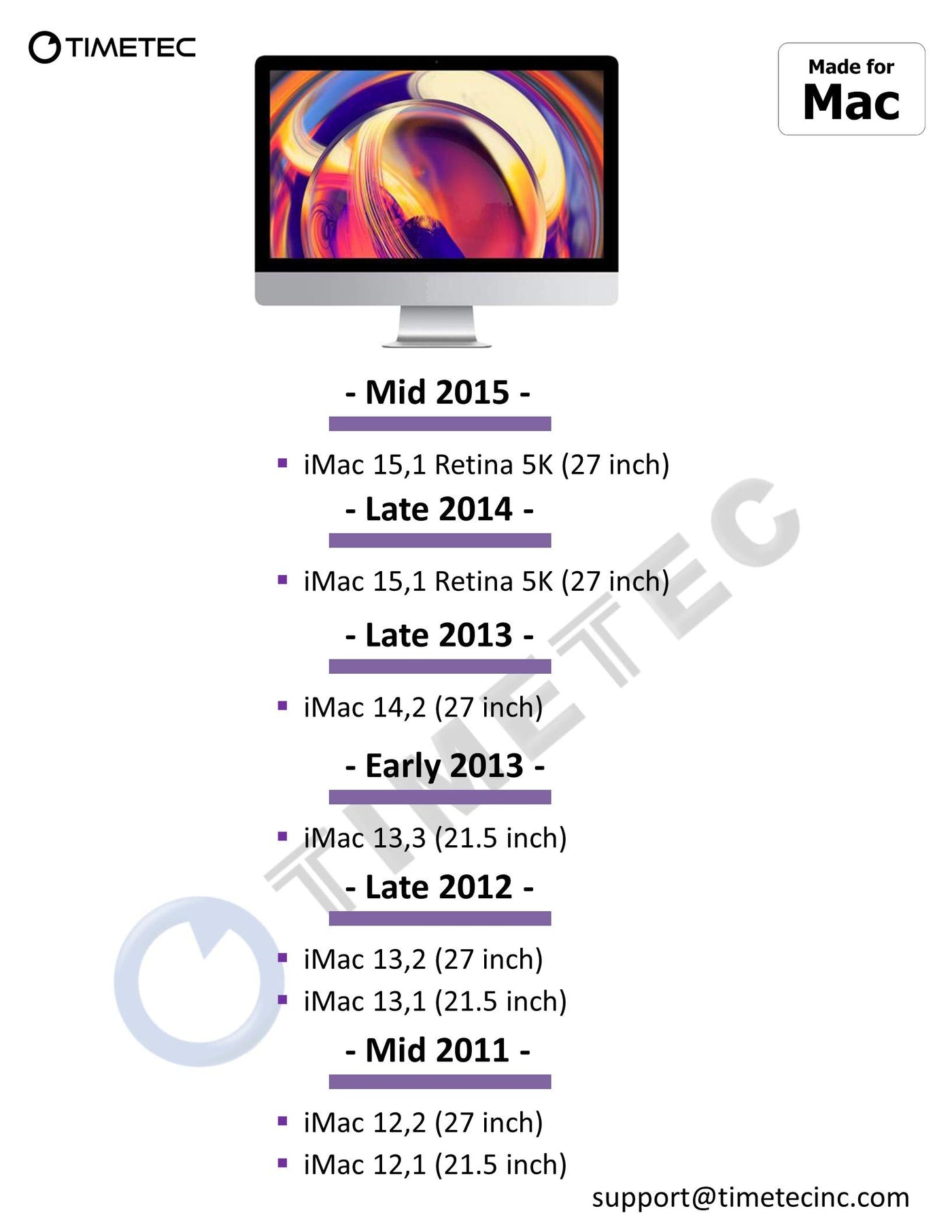 Timetec - Memory Of A Lifetimecompatible With (But Not Limited To):Macbook Pro 9,2 (13-Inch Mid 2012))2.5 Ghz Core I5 (I5-3210M)2.9 Ghz Core I7 (I7-3520M)Macbook Pro 9,1 (15-Inch Mid 2012)2.3 Ghz Core I7 (I7-3615Qm)2.6 Ghz Core I7 (I7-3720Qm)2.7 Ghz Core I7 (I7-3820Qm)Macbook Pro 8,3 (17-Inch Late 2011)2.4 Ghz Core I7 (I7-2760Qm)2.5 Ghz Core I7 (I7-2860Qm)Macbook Pro 8,2 (15-Inch Late 2011)2.2 Ghz Core I7 (I7-2675Qm)2.4 Ghz Core I7 (I7-2760Qm)2.5 Ghz Core I7 (I7-2860Qm)Macbook Pro 8,1 (13-Inch Late 2011)2.4 Ghz Core I5 (I5-2435M)2.8 Ghz Core I7 (I7-2640M)Macbook Pro 8,3 (17-Inch Early 2011)2.2 Ghz Core I7 (I7-2720Qm)2.3 Ghz Core I7 (I7-2820Qm)Macbook Pro 8,2 (15-Inch Early 2011)2.0 Ghz Core I7 (I7-2635Qm)2.2 Ghz Core I7 (I7-2720Qm)2.3 Ghz Core I7 (I7-2820Qm)Macbook Pro 8,1 (13-Inch Early 2011)2.3 Ghz Core I5 (I5-2415M)2.7 Ghz Core I7 (I7-2620M)Imac 15,1 W/Retina 5K Display (27-Inch Mid 2015)3.3 Ghz Core I5Imac 15,1 W/Retina 5K Display (27-Inch Late 2014)3.5 Ghz Core I5 4.0 Ghz Core I7Imac 14,2 (27-Inch Late 2013)3.2 Ghz Core I5 3.4 Ghz Core I5 3.5 Ghz Core I7Imac 13,3 (21.5-Inch Early 2013)3.3 Ghz Core I3Imac 13,2 (27-Inch Late 2012)2.9 Ghz Core I5 3.2 Ghz Core I5 3.4 Ghz Core I7Imac 13,1 (21.5-Inch Late 2012)2.7 Ghz Core I5 2.9 Ghz Core I5 3.1 Ghz Core I7Mac Mini 6,2 (Late 2012)2.3 Ghz Core I7 2.6 Ghz Core I7Mac Mini 6,2 (Late 2012 Server)2.3 Ghz Core I7 2.6 Ghz Core I7Mac Mini 6,1 (Late 2012)2.5 Ghz Core I5Mac Mini 5,3 (Mid 2011 Server)2.0 Ghz Core I7Mac Mini 5,2 (Mid 2011)2.5 Ghz Core I52.7 Ghz Core I7Mac Mini 5,1 (Mid 2011)2.3 Ghz Core I5
