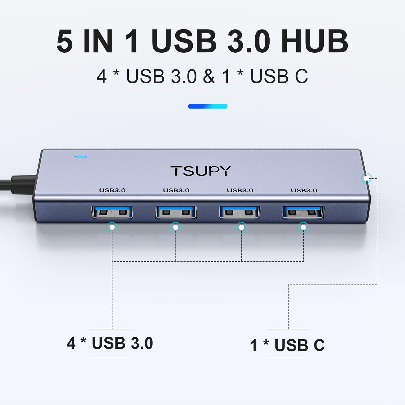 Usb 3.0 Hub, Tsupy Usb Splitter With 5 Usb Ports And 4Ft Extended Cable,Ultra Slim Aluminium Data Hub Multi Usb 3.0 Adapter Hub Compatible For Laptop,Macbook,Pc, Printer, Mobile Hdd And More