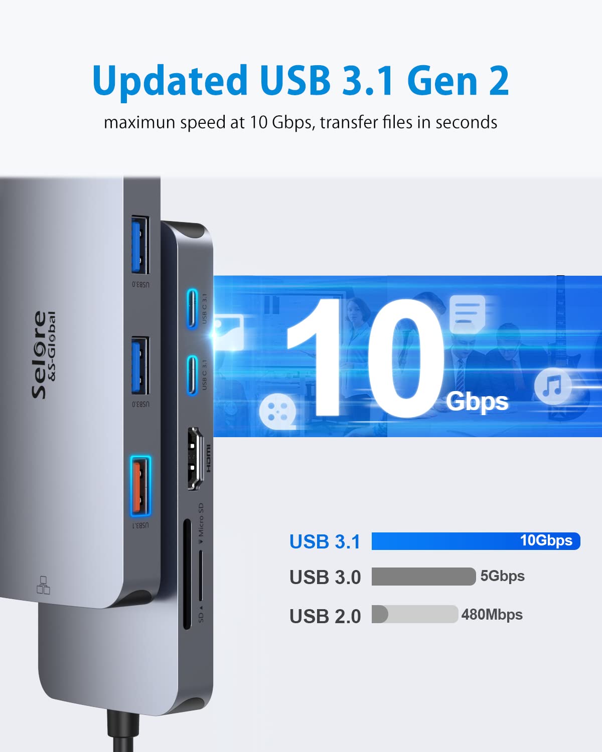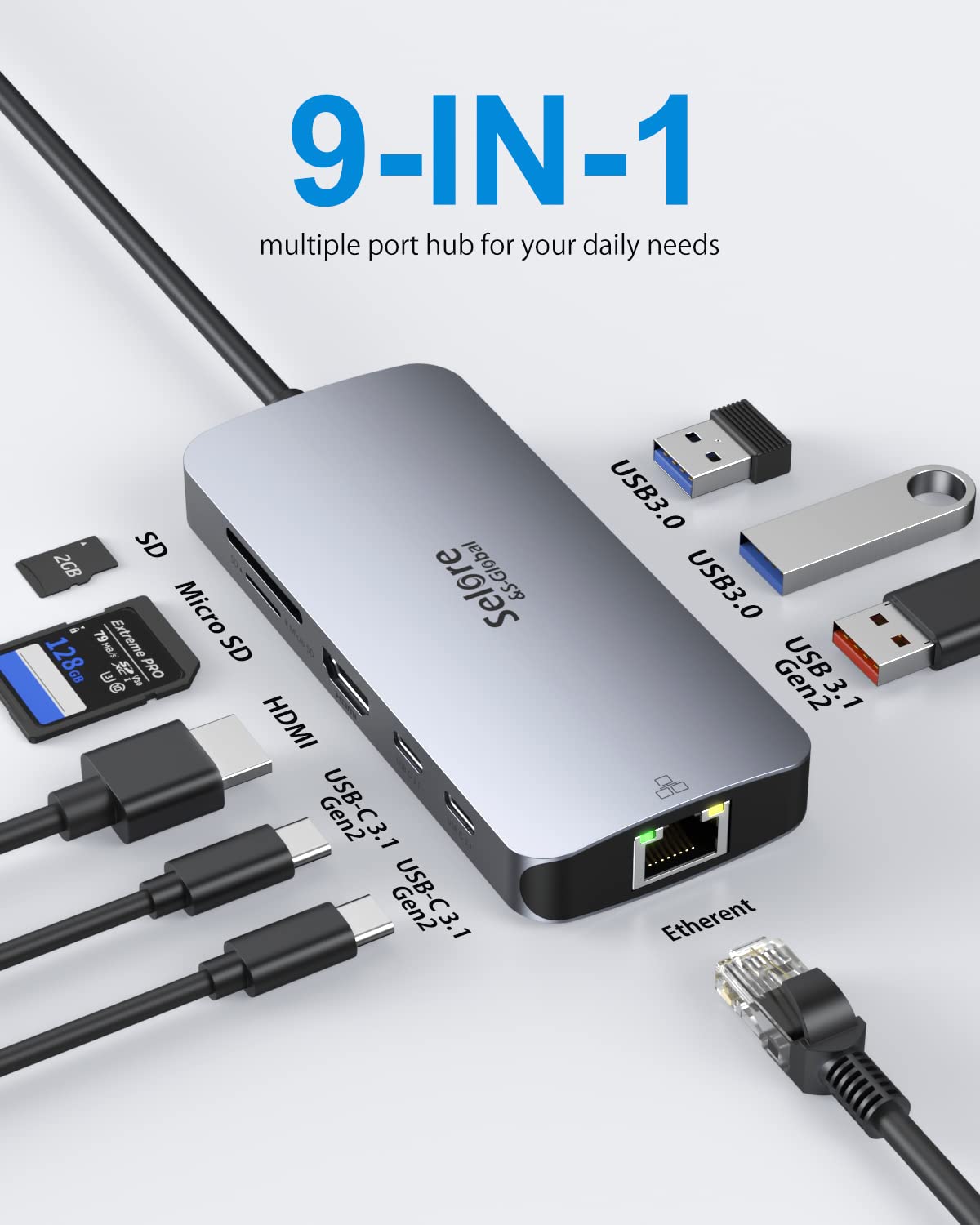 Usb C Adapters For Macbook Pro/Air, Selore 9 In 1 Usb C Hub With 4K Hdmi, 2 * 10Gbps Usb C 3.1 Gen2 Port, 1Gbps Ethernet, Usb 3.
