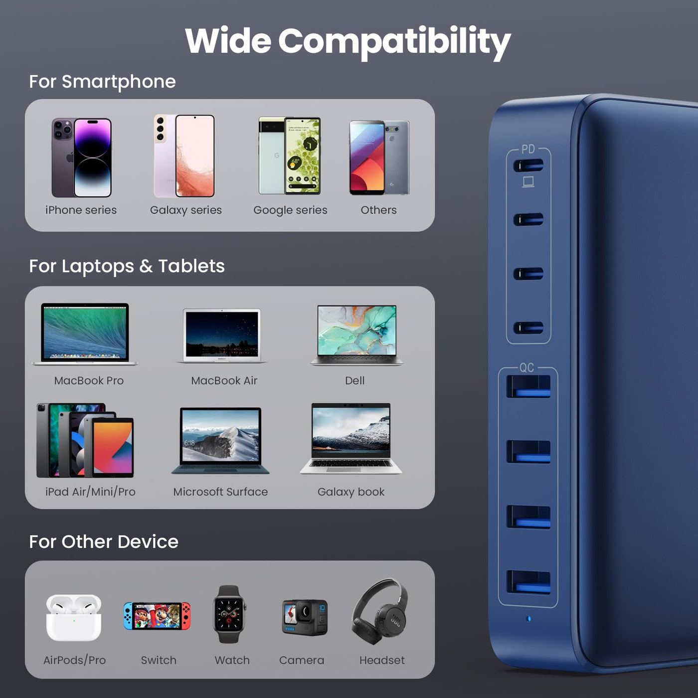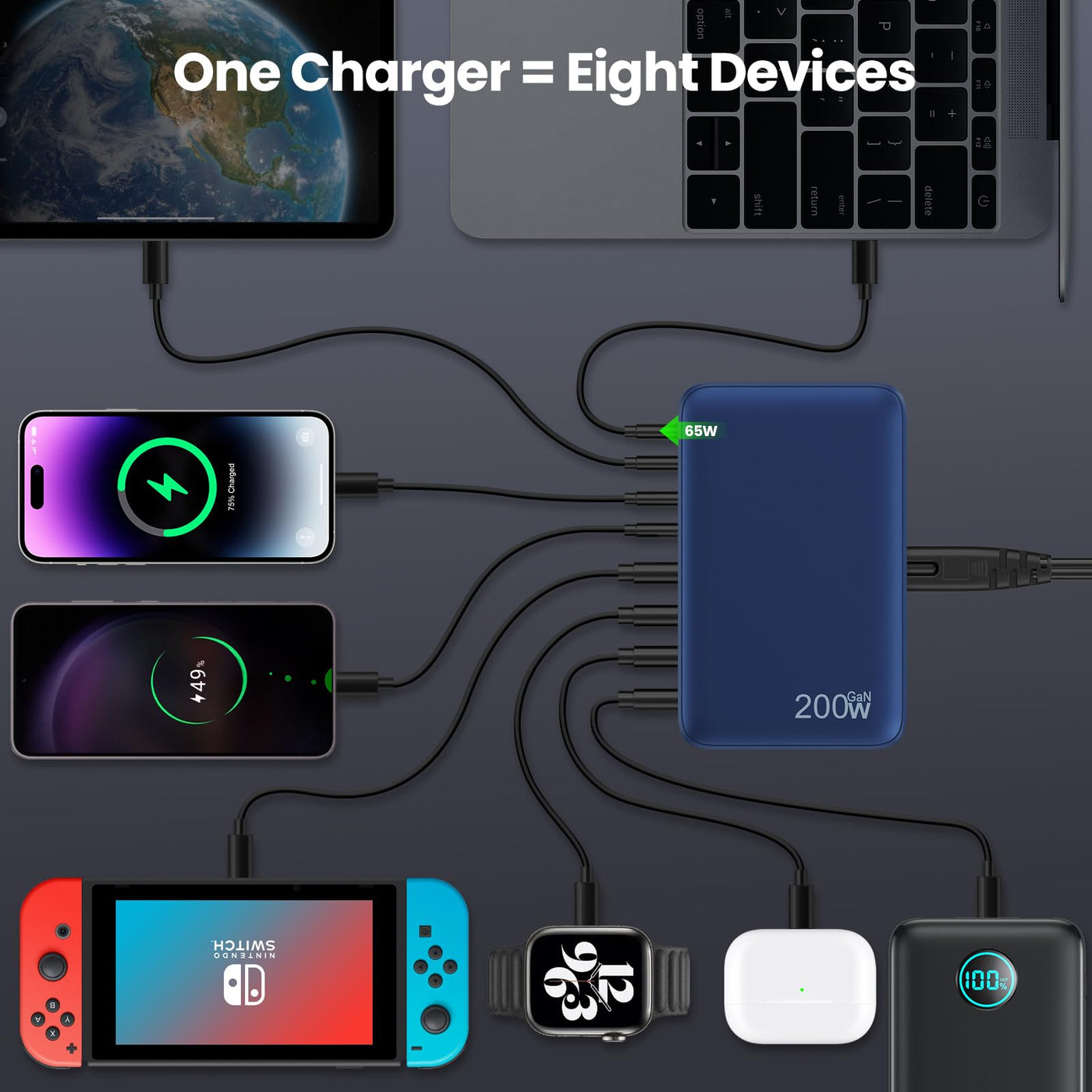Q: Can I charge multiple devices at the same time?A: Yes, the USB C Charger 200W features 8 ports that allow you to charge up to 8 devices simultaneously, making it perfect for families or shared workspaces.