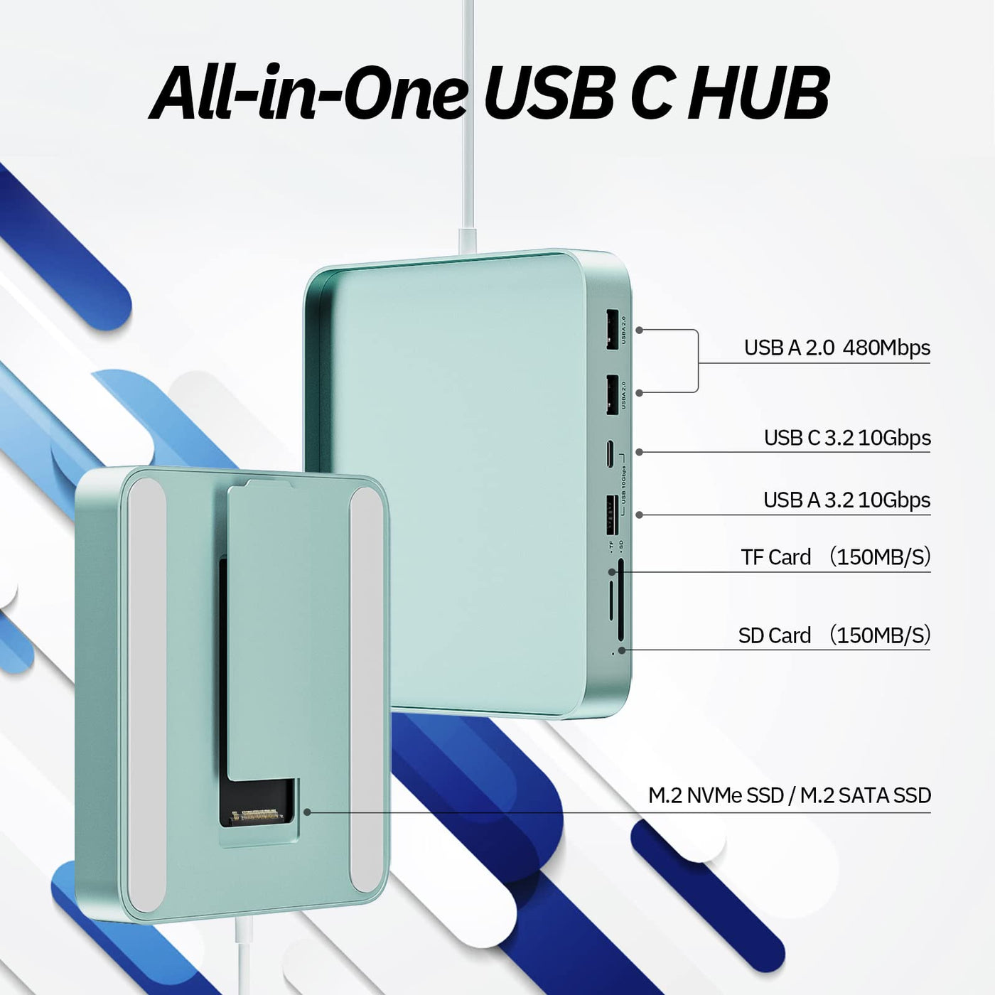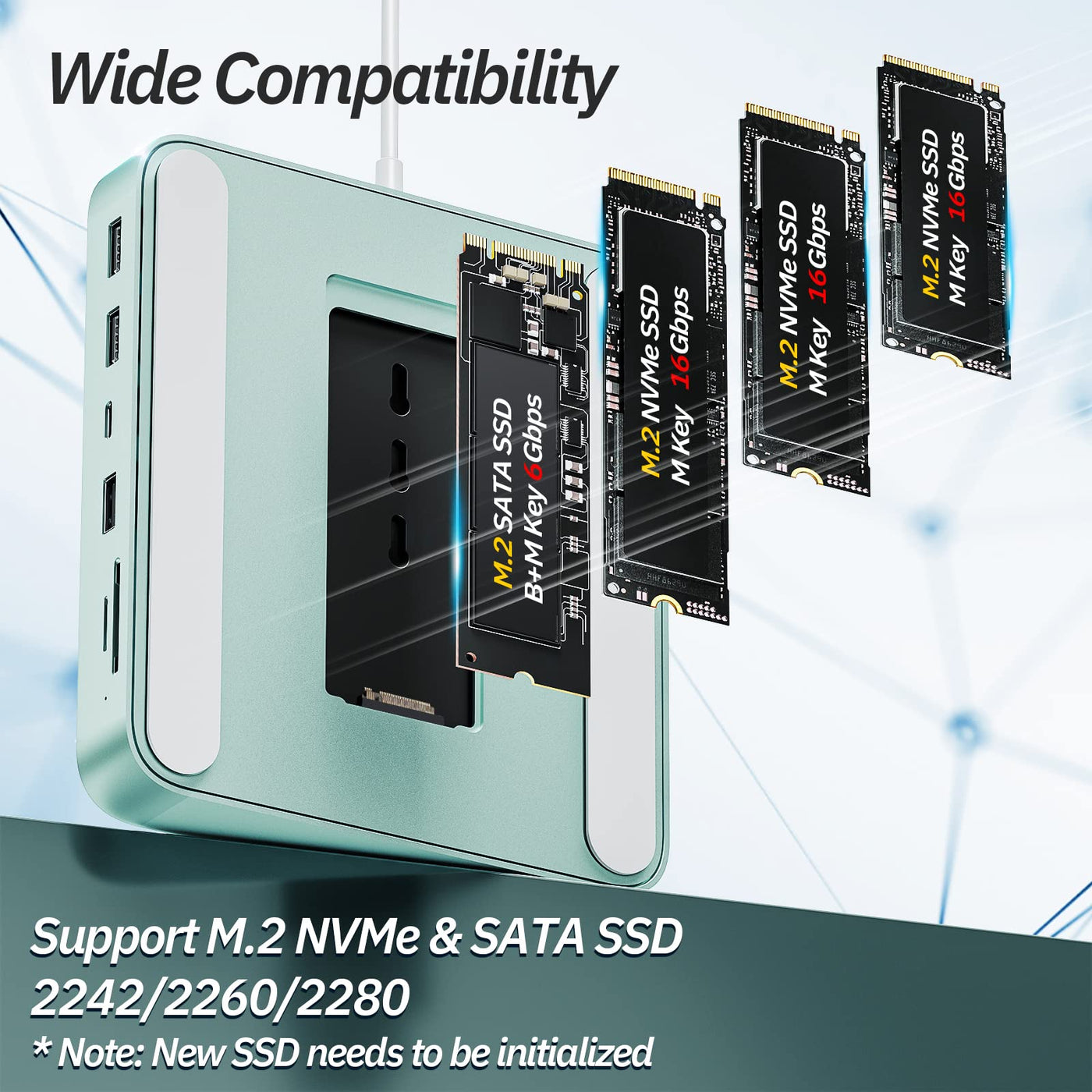 Q: Can I use an M.2 NVMe SSD with this hub, and how do I install it?A: Yes, the USB C Hub supports M.2 NVMe SSDs (not included) with a 16Gbps interface. Installation is easy, thanks to a dedicated slot designed for 2242/2260/2280 M.2 SSDs, allowing for storage expansion up to 2TB.