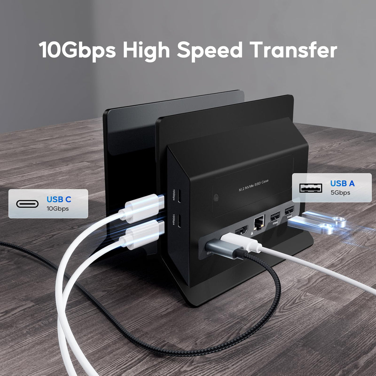 Q: What is the data transfer speed for USB ports on the docking station?A: The docking station includes two USB-C ports that support data transfer speeds of up to 10Gbps and two USB-A 3.0 ports with speeds of up to 5Gbps, allowing for fast file transfers.