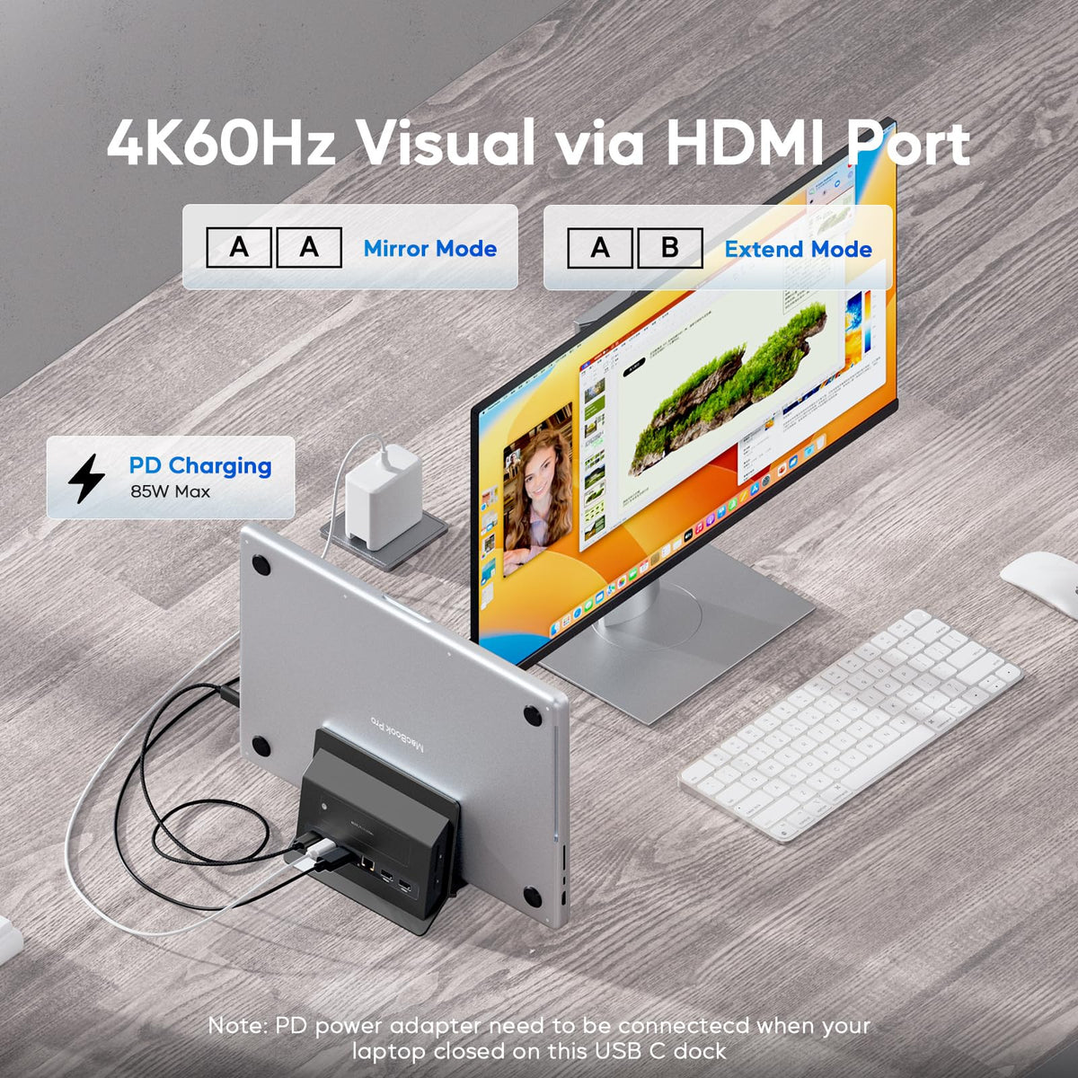Q: How does the power delivery feature work with this docking station?A: This docking station features a 100W Power Delivery (PD) charge port, allowing you to charge your laptop while using all its functions. Ensure you connect a power adapter of 65W or above for optimal performance.