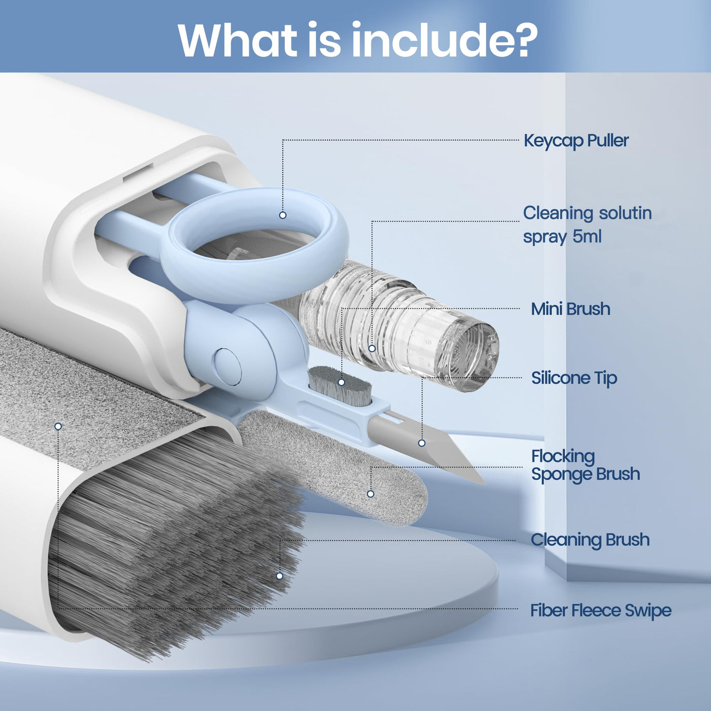 Q: What cleaning tools are included in the VUBOJO Laptop Screen Keyboard Earbud Cleaner Kit?A: The VUBOJO Cleaner Kit includes a 7-in-1 multipurpose cleaning tool featuring an Airpod cleaning pen with a silicone clip, a flocking sponge and brush, a keyboard clip, a screen cleaner spray, and a high-quality microfiber retractable keyboard brush for various cleaning needs.
