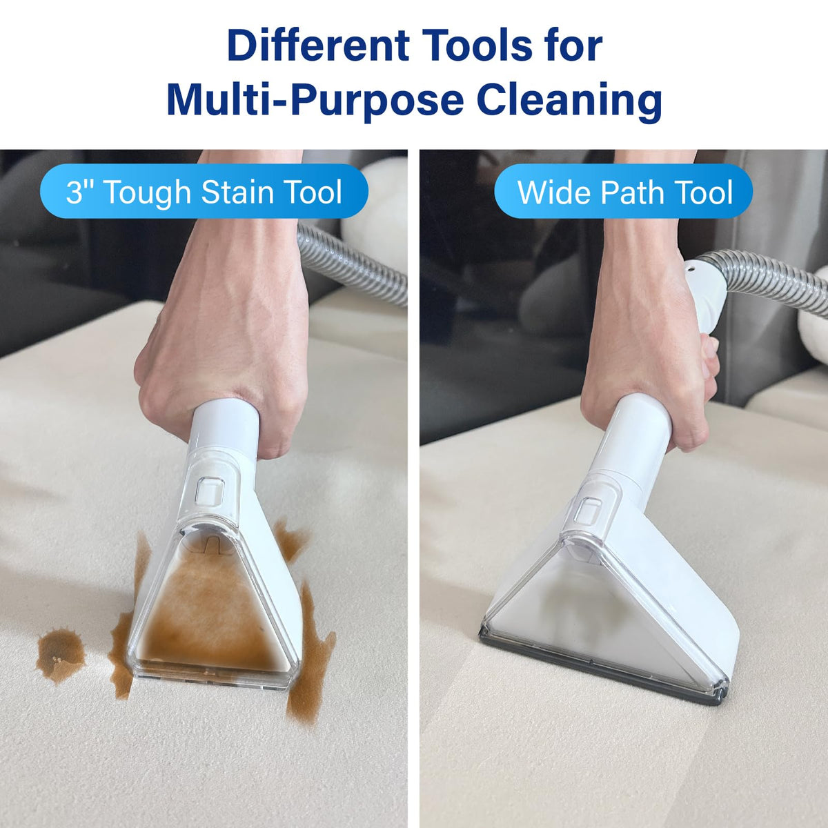Q: What type of surfaces can the WURESE Portable Carpet Cleaner effectively clean?A: The WURESE Portable Carpet Cleaner is versatile and suitable for cleaning various surfaces, including carpets, upholstery, stairs, and even car interiors. Its powerful suction and specialized cleaning tools make it ideal for tackling tough stains on multiple fabric types.