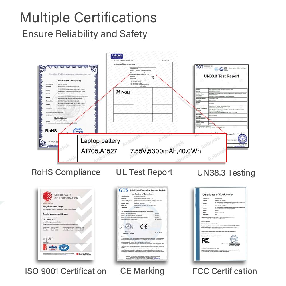 Q: What safety certifications does the XINGLT A1705 battery have?A: The XINGLT A1705 battery is UL, CE, FCC, and RoHS certified, ensuring it meets safety standards for lithium-ion batteries and providing peace of mind during use.
