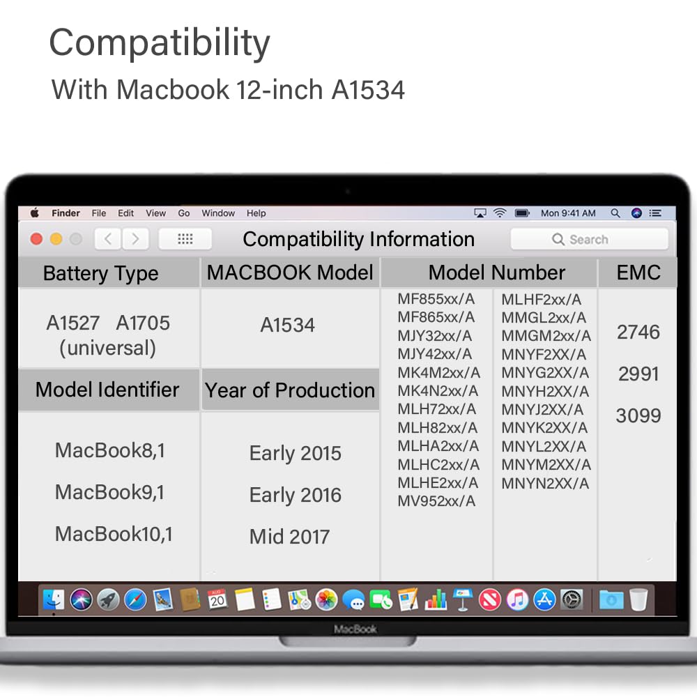 Q: What MacBook models are compatible with the XINGLT A1705 battery?A: The XINGLT A1705 battery is compatible with MacBook 12 inch Retina models A1534 and A1705 from Early 2015, Early 2016, and Mid 2017, specifically fitting EMC 2746, 2991, and 3099.