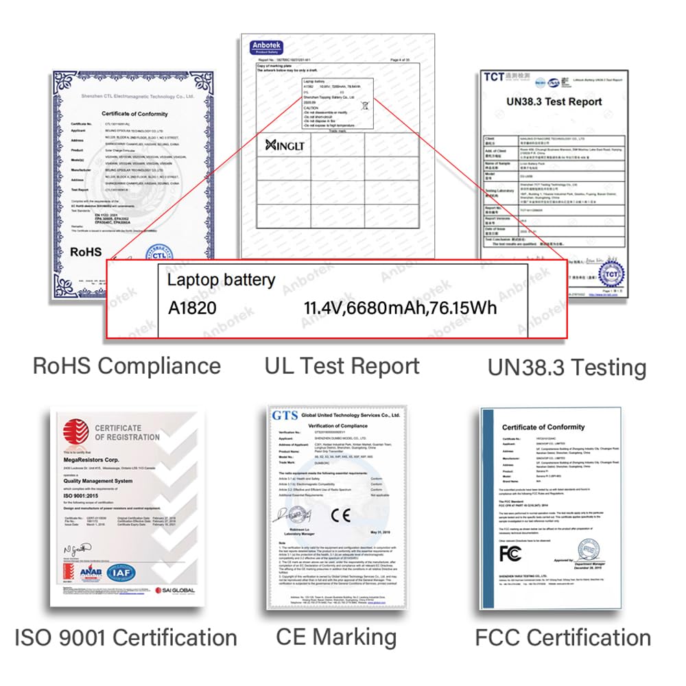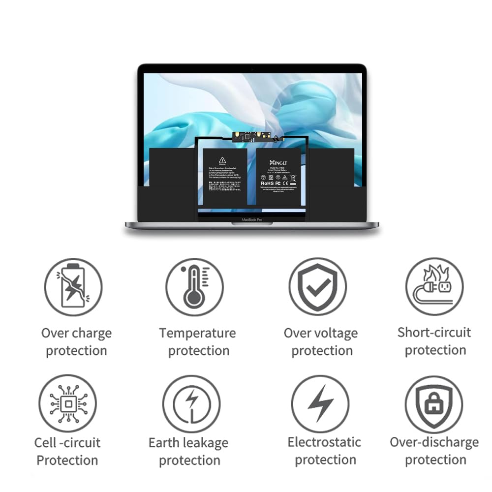 Q: What safety certifications does the XINGLT A1707 Replacement Battery have?A: The XINGLT A1707 Replacement Battery is UL-, CE-, FCC-, and RoHS-certified, ensuring it meets safety and environmental standards. Built-in circuit protection also guarantees safety and stability during use.