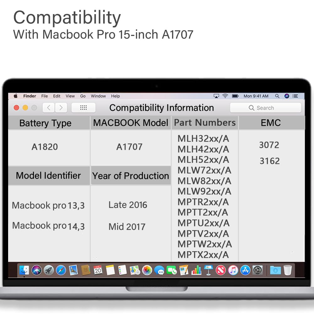 < B >A1707 Macbook Pro Battery Replacement A1820 Parameter< /B >< Br >A1707 Battery Capacity: 6800Mah/76.15Wh , Voltage: 11.4V ,Battery Type: Lithium Polymer< Br > Compatible With Macbook Pro 15'' A1707 (Late 2016, Mid 2017) Details< Br > < Br > < B >Compatible With Macbook Pro 15 A1707 (Late 2016)< /B >< Br > Compatible With Macbook Pro 13,3 Emc3072(Mlh32Xx/A,Mlh42Xx/A,Mlh52Xx/A,Mlw72Xx/A,Mlw82Xx/A,Mlw92Xx/A);< Br > < Br > < B >Compatible With Macbook Pro 15 A1707 (Mid 2017)< /B >< Br > Comapatible With Macbook Pro 14,3 Emc 3162(Mptr2Xx/A,Mptt2Xx/A,Mptu2Xx/A,Mptv2Xx/A,Mptw2Xx/A,Mptx2Xx/A)< Br > Tips:Please Identify The Model And Year Of Your Mac And Make Sure They Are Listed.< Br >< Br > < B >Compatible Laptop/Notebook Model Details --Macbook Pro 13 Inch A1502 (Early 2015) Macbookpro12.1< /B >< Br > < Br > Mf839**/A 13.3''/2.7 I5/8Gb/128Gb Flash< Br > Mf840**/A 13.3''/2.7 I5/8Gb/256Gb Flash< Br > Mf841**/A 13.3''/2.9 I5/8Gb/512Gb Flash< Br > Mf843**/A 13.3''/3.1 I5/16Gb/512Gb Flash< Br >