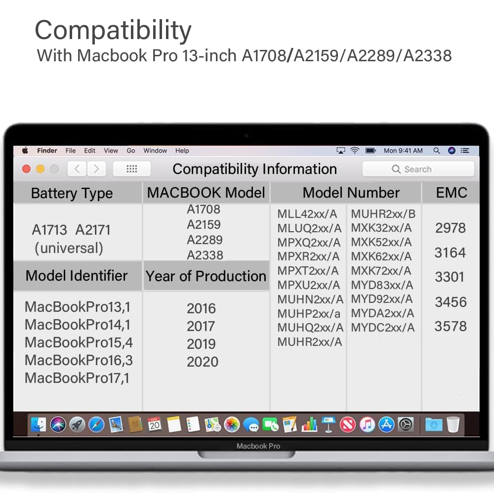 < B >A1708 Macbook Pro Battery Replacement Parameters.< /B >< Br > Capacity: 5800Mah/66.18Wh , Voltage: 11.41V,Battery Type: Lithium Polymer< Br > Note:Use ''Ctrl'' + ''F'' To Find Your Models.Each Cell Has A Layer Of Plastic Film Attached To It.This Is Used To Protect The Cells. Please Do Not Remove Them. Xinglt Macbook Pro Battery Compatible Part Numbers: A1708 A2159 Compatible With Macbook Pro 13'' Battery Modes: A1713 A2171 Compatible Models: Macbook Pro 13-Inch ''Core I5'' 2.0 Late 2016 Macbook Pro 13-Inch ''Core I7'' 2.4 Late 2016 Macbook Pro 13-Inch ''Core I5'' 2.3 Mid-2017 Macbook Pro 13-Inch ''Core I7'' 2.5 Mid-2017 Macbook Pro 13-Inch ''Core I5'' 1.4 Touch/2019 2 Tb 3 Macbook Pro 13-Inch ''Core I7'' 1.7 Touch/2019 2 Tb 3 Macbook Pro 13 Inch Computer Order Models: Mll42Xx/A Mluq2Xx/A Mpxq2Xx/A Mpxr2Xx/A Mpxt2Xx/A Mpxu2Xx/A Muhn2Xx/A Muhp2Xx/A Muhq2Xx/A Muhr2Xx/A Muhr2Xx/B Emc Serial Number: 2978 3164 3301 Package Include: 1 X Macbook Battery; 1 X Battery Manual; And A Full Set Of Disassembly Tools.