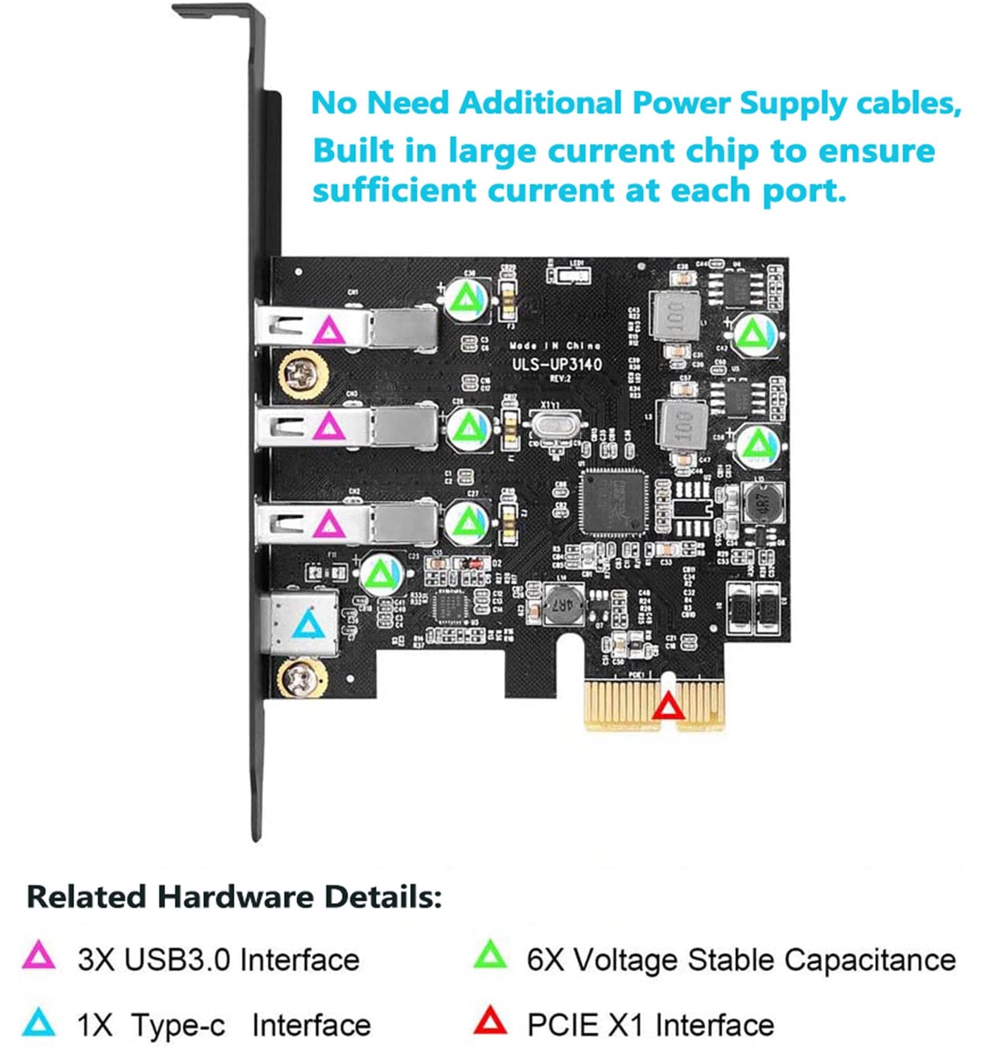 Product Advantages: 1.Extend With 1 Port Usb 3.0 Usb C, 3 Ports Usb A Downstream Compatible With Usb 2.0 And 1.1 Devices Ports For Standard Desktop Pc. 2.Support Uasp:70% Faster Than Traditional Usb 3.0 With Uasp. The Uasp Transfer Protocol Only Can Accelerate Read And Write Speed Of Ssd Hard Disk. 3.Compliant With Usb 3.0 ,Usb 2.0 Specification. 4. Date Transfer Rates Up To 5.0Gbps - 10X Faster Than Usb2.0. 5.Plug & Play And Hot Swapping Capability. Operating Systems: For Windows Xp/Vista/Server/7/8/10/11,(Win Xp/Vista/Server Systems Require The Installation Of The Cd Driver. ) For Mac Pro 3.1,4.1,5.1(Model 2009~2020). For Linux And Ubuntu 20.04. Note: 1. Not Compatible With Old Pci. 2. The Interface Only Supports The Transmission Of Data Signals, Not Video Signals, Thunderbolt Protocol, Monitor. 3. For The Usb A Port It Is Recommended To:Take A Usb Cable (A End) And See If It Will Fit Horizontally In The Slot Of Your Case. Then Take The Usb Cable And Insert It Into The Card So That It Will Center The Ports. Package 1X Pcie Usb Card 1X Cd Driver 1X Mounting Screw