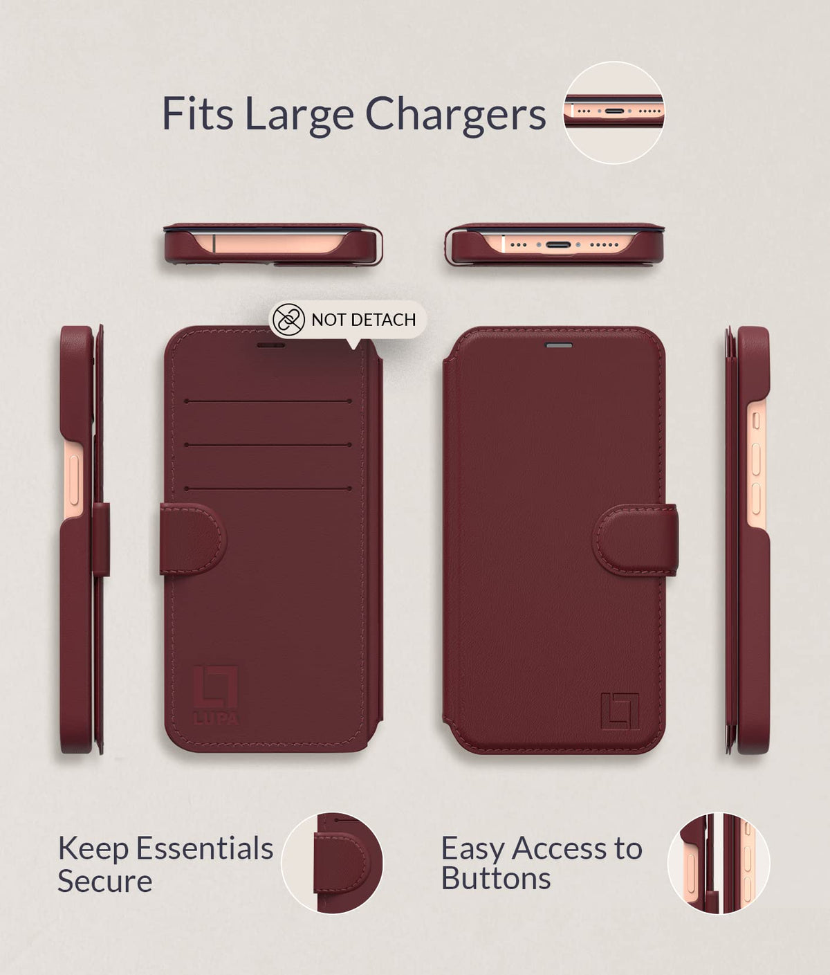 Q: What materials are used in the LUPA Legacy Wallet Case?A: The wallet case is made from high-quality faux leather, featuring handcrafted stitching that combines durability with a luxurious look.