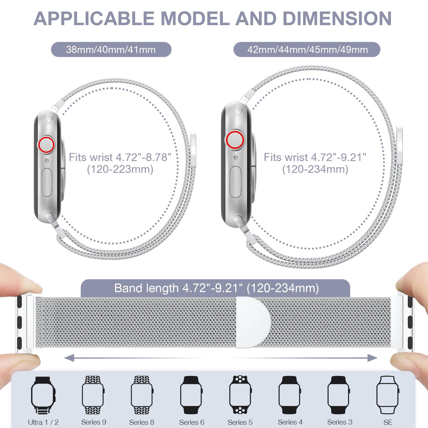 Q: Is the BELONGME Mesh Metal Loop compatible with all Apple Watch models?A: Yes, the BELONGME Mesh Metal Loop is fully compatible with Apple Watch models 40mm, 41mm, 38mm, 42mm, and series 10, 9, 8, 7, 6, 5, 4, 3, 2, 1, including the SE model.