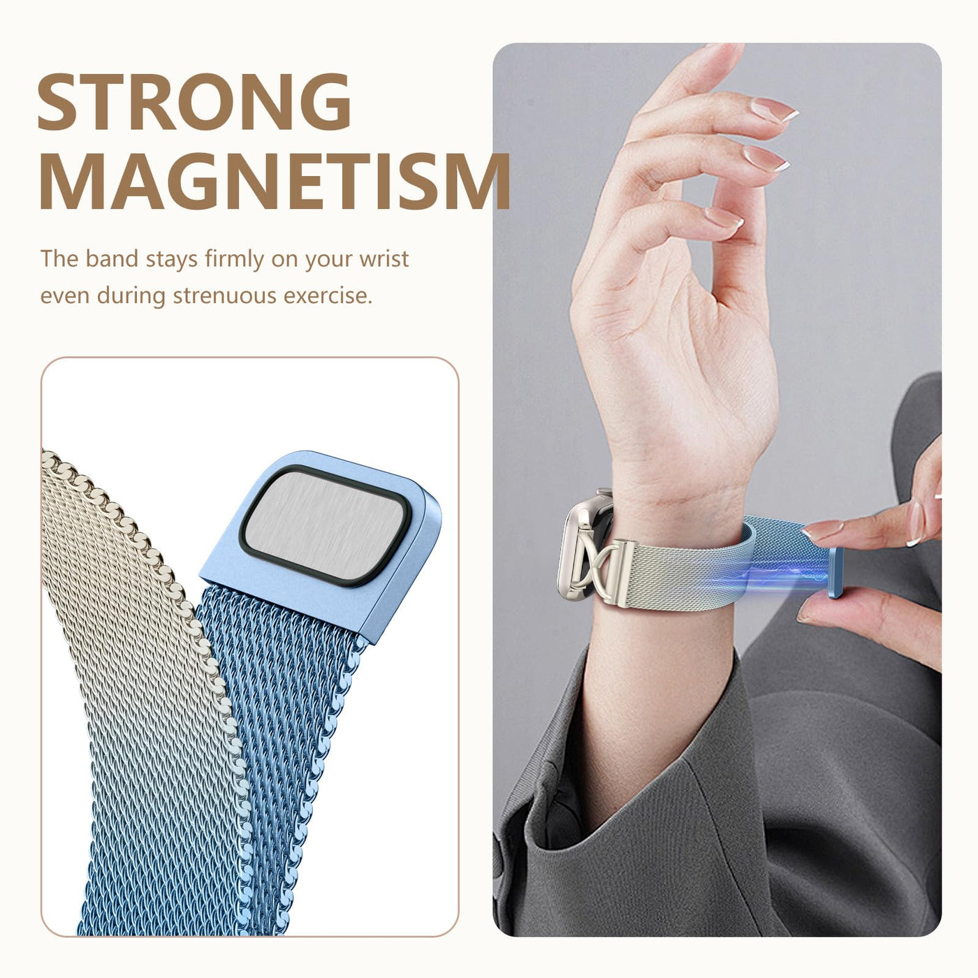 Q: How does the magnetic clasp work on the Dirrelo Band?A: The Dirrelo Band features a strong magnetic clasp that securely holds the band in place, ensuring it doesn't loosen during wear. This design allows for easy adjustment, providing a perfect fit for wrist sizes between 6.6" and 8.46" (170mm-215mm). Simply hold the two ends of the band close to each other, and the magnets will pull them together.