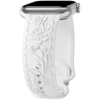 Q: What material is the Floral Engraved Band made from?A: The band is made from high-quality soft silicone, which is flexible, comfortable, and designed to prevent skin irritation, making it great for everyday wear.