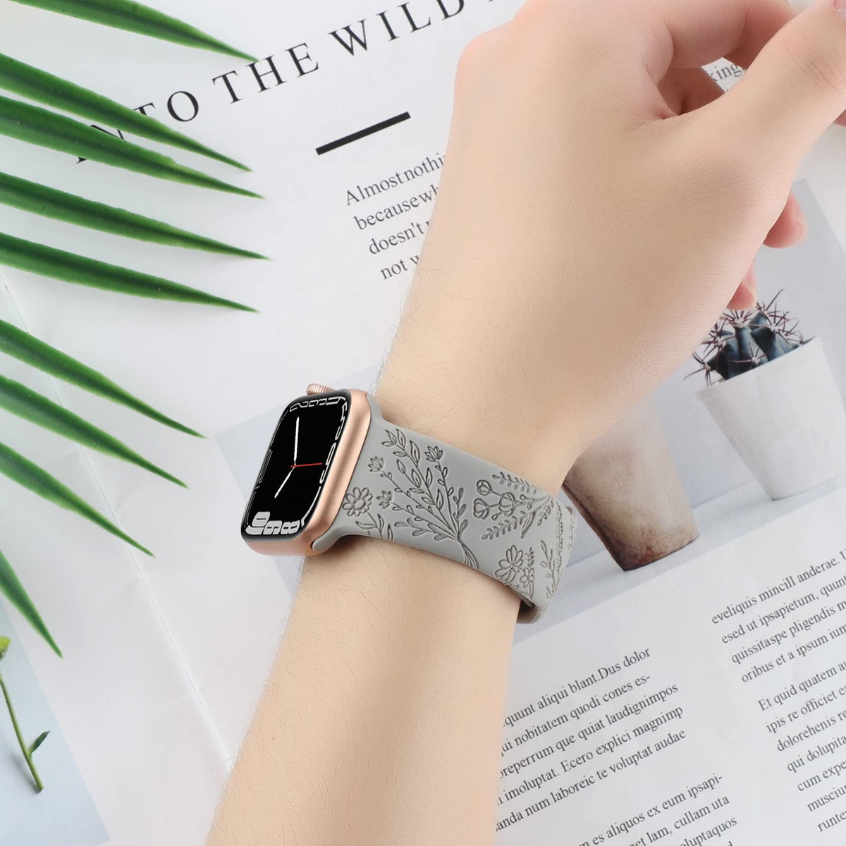 Q: What Apple Watch models are compatible with the Flower Engraved Silicone Band?A: The Flower Engraved Silicone Band is compatible with various Apple Watch models, including Series 8, Series 7, Series 6, Series 5, Series 4, Series 3, Series 2, Series 1, and SE. It fits 38mm, 40mm, and 41mm sizes, making it versatile for different wrist sizes.