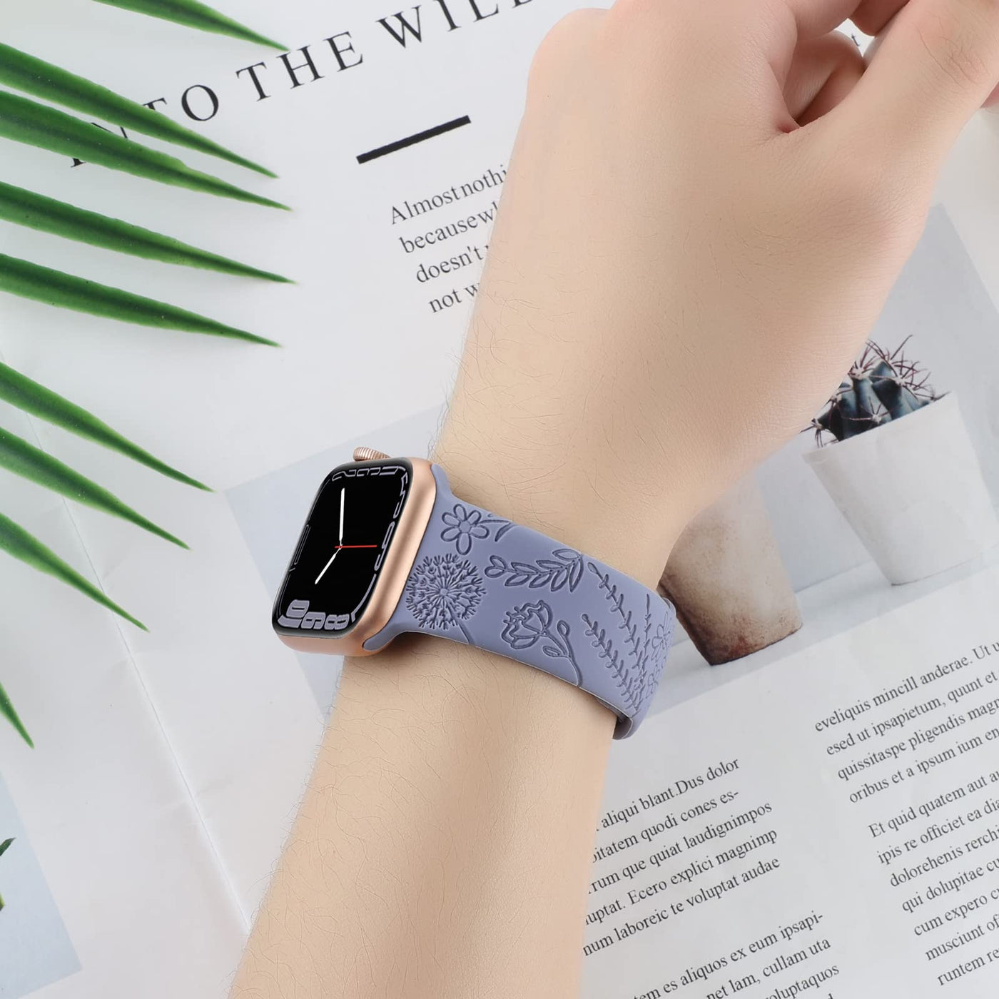 Flower Engraved Silicone Band Compatible With Apple Watch Bands 38Mm 40Mm 41Mm, Cute Women Wildflowers Floral Design Soft Sport Strap Replacement Wristbands For Iwatch Series 8 7/Se/6/5/4/3/2/1 (42/44/45Mm, Green Lavender)