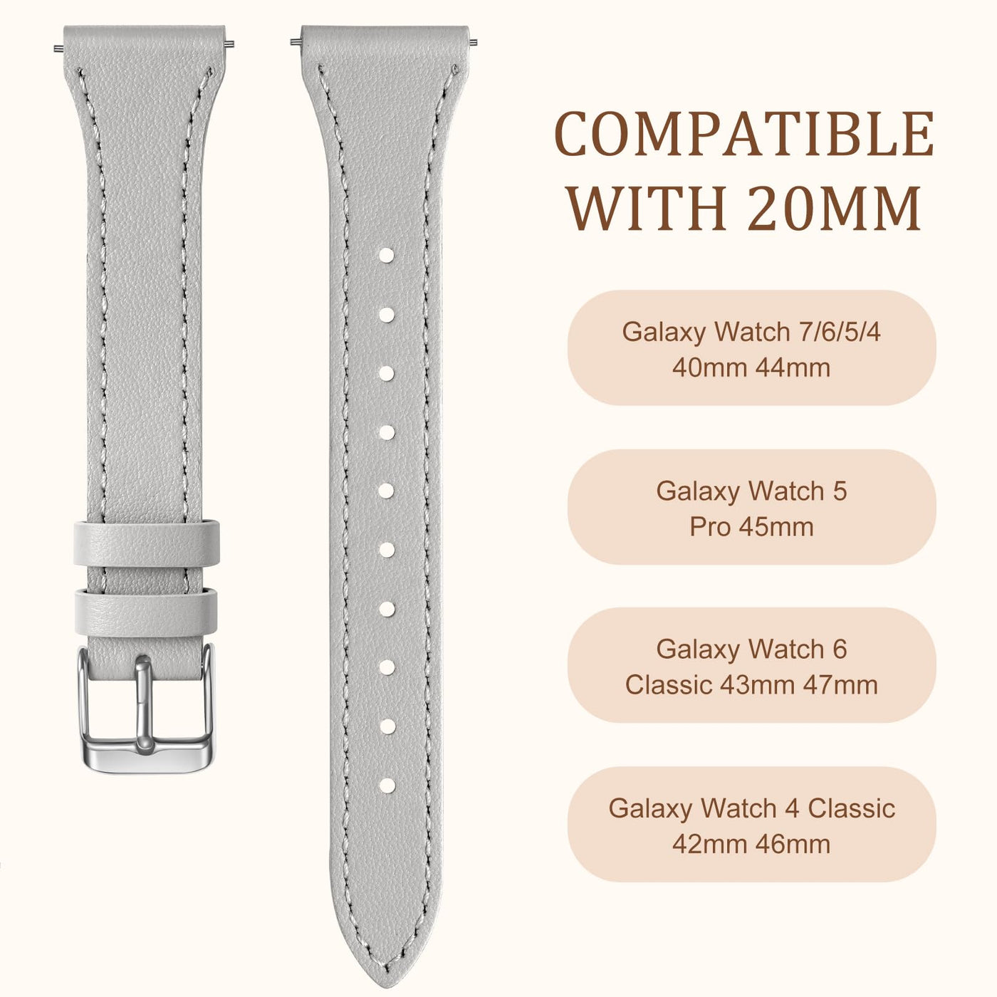 Q: What watches are compatible with the GEAK Slim Leather Band?A: The GEAK Slim Leather Band is compatible with various Samsung Galaxy Watch models, including the Galaxy Watch 7 (40mm and 44mm), Galaxy Watch 6, 5, 4 (40mm and 44mm), Galaxy Watch 5 Pro (45mm), Galaxy Watch 4 Classic (46mm and 42mm), Galaxy Watch 6 Classic (47mm and 43mm), Galaxy Active 2 (40mm and 44mm), Galaxy Watch 42mm, Galaxy Watch 3 (41mm), Gear Sport, Gear S2 Classic, Moto 360 2nd Gen (42mm), and other smartwatches with a 20mm band width.