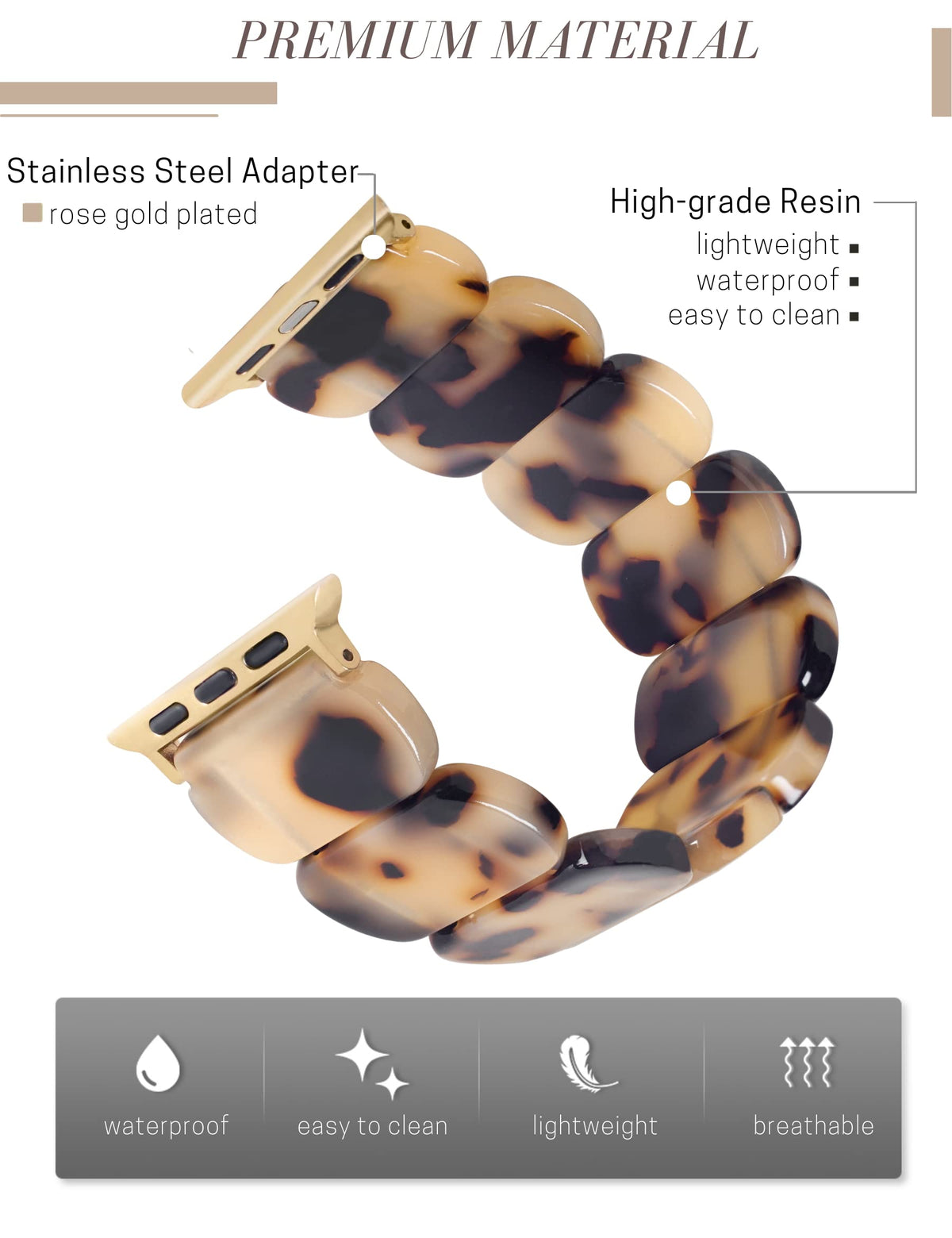 Q: What material is the Heesch Blonde Tortoise Band made from?A: The Heesch Blonde Tortoise Band is crafted from high-end resin material known as acetate, which is lightweight, shimmery, and durable. The band also features a rosegold-plated stainless steel watchband adapter for added durability.