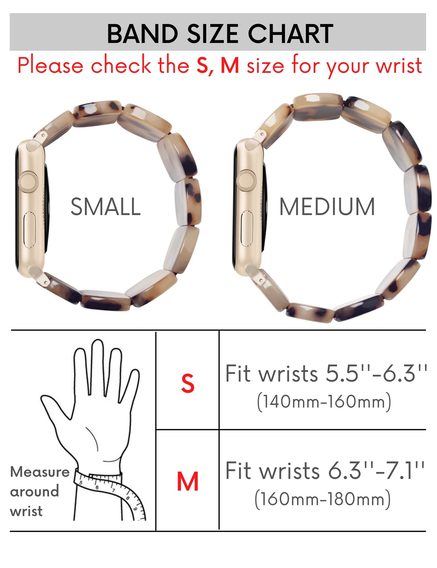 Q: What sizes does the Heesch Blonde Tortoise Band come in?A: The Heesch Blonde Tortoise Band is available in two sizes: SMALL fits wrists measuring 5.5''-6.3'' (140-160mm) and MEDIUM fits wrists measuring 6.3''-7.1'' (160-180mm). Be sure to measure your wrist to select the most comfortable fit.