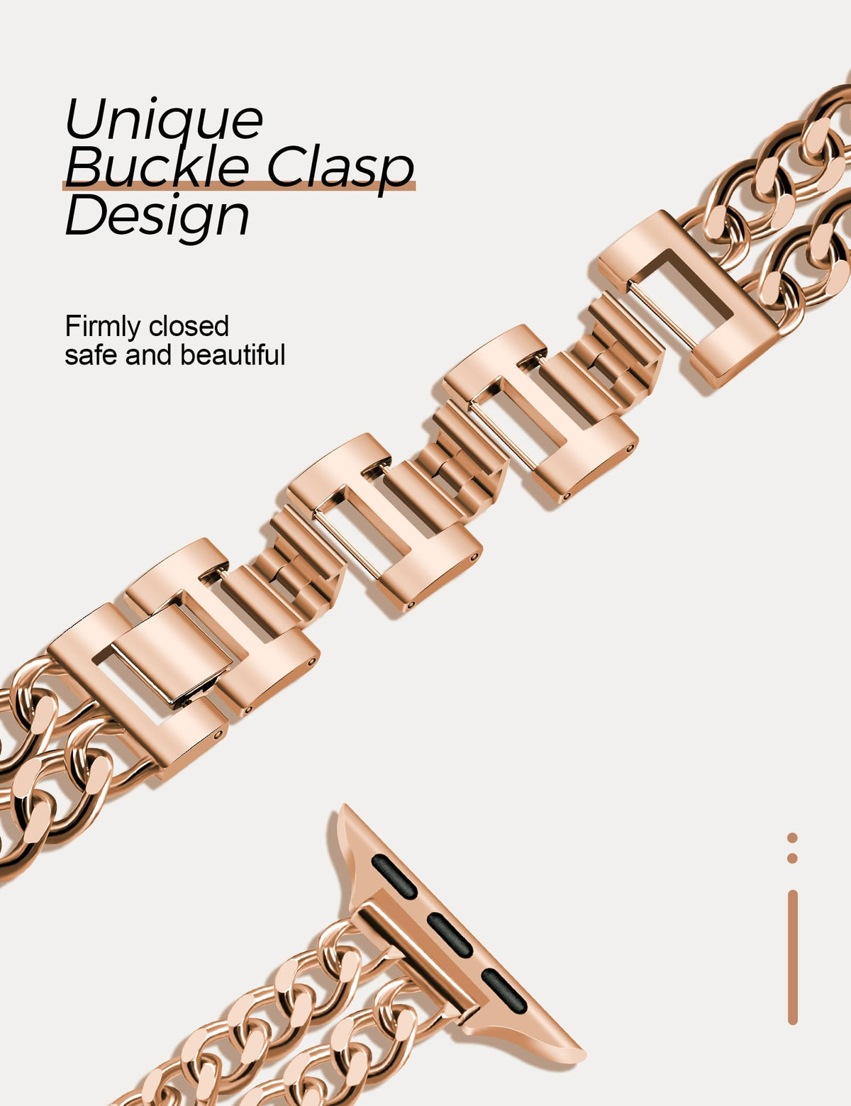 High Quality And Durable: This Iwatch Band Is Made Of Premium Metal Alloy And Well-Polished By Hand. Vacuum Electroplating The Whole Watch Band Makes It Durable And Keeps The Color Lasting Longer. | Elegant And Stylish: The Metal Watch Band Is Made With A Fashion Double Chain Design, Which Gives Your Outfit A Western Cowboy-Style, Elegant And Fashion Look. It Perfectly Fits Any Outfits, Casual, Dressy, Business Looks, Etc.. For Work, Dates, Party, Shopping, Show, Any Leisure, Or Special Occasions. | Safe And Beautiful: Made Of Unqiue Buckle Clasp Design, The Band Is Firmly Closed And Fit Your Wrist Well, More Beautiful And Safety. The Watch Band Is Also Easy To Wear And Take Off With The Buckle Clasps. | Adjustable Length And Easy Removing Links: We Add 3 More Detachable Clasps To Extend The Band Length. You Can Easily Adjust The Length By Hand Even Without Tools. It Is Very Convenient And Easy To Work With. It Fit Wrist Size: 5.4''-7'' (137 Mm-188 Mm) | Compatible With All Apple Watch Models: This Fashion Watch Band Pairs With All Apple Watch Series 10/9/8/7/6/5/4/3/2/1/Se/Ultra. The Watch Connector Comes In 2 Sizes - 38Mm/40Mm/41Mm/42Mm(Series 10) And 42Mm(Series 1/2/3)/44Mm/45Mm/46Mm/49Mm. Warm Tips-No Cover Included, Only Watch Band