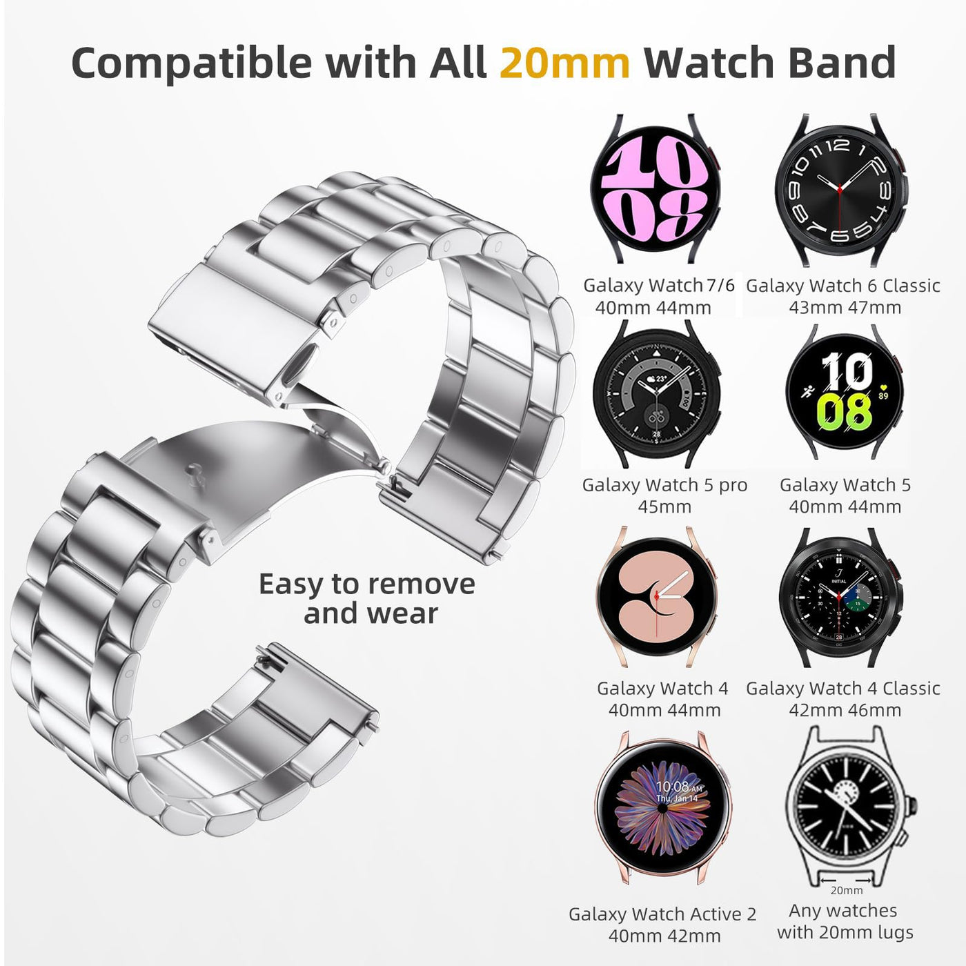 Lerobo 20Mm Stylish Sport Band Perfectly Fit All Watches With 20Mm Lug: --Compatible With Samsung Galaxy Watch 7 6 5 4 Fe 40Mm 44Mm And For Galaxy Watch 4 Classic 42Mm/For Galaxy Watch 4 Classic 46Mm --Compatible With Samsung Galaxy Watch Active 2 40Mm 44Mm(For Galaxy Watch Active2 40Mm/For Galaxy Watch Active2 44Mm) --Compatible With Samsung Galaxy Watch 3 41Mm --Compatible With Samsung Galaxy Watch Active 40Mm --Compatible With Samsung Galaxy Watch 42Mm --For Gear Sport Watch --Compatible With Samsung Watch 7 6 5 4 Band 40Mm 44Mm --Lerobo Band Compatible For Galaxy Watch 6 Classic/Galaxy Watch 4 Classic (For Huawei Watch 2/2 Pro/Huawei Watch 2 Sport/Garmin Vivoactive 3/Vivomove Hr Etc.) *Note:Please Make Sure Your Smartwatch Model With 20Mm Lugs Before You Purchase It. Adjustable Size For Women Men: Size: Suitable For 6.2''''- 8.3'''' Wrist; Comfort: -Material:Crafted From Top Stainless Steel With A Smooth Surface, Which Enhances The Comfort And Durability Of The Watch Band. It Will Be Comfortable Touch Feeling On Your Wrist Without Hurting Your Skin, Luxury, Handsome And Practical, Nobility And Durability, A Great Affordable Option For Your Samsung Watch Accessories Stylish: -Multi-Color Selection:A Variety Of Colors Are Available For Perfect For Daily And Nightly Wear. Aesthetics Design Watch Bands For Work, Date, Party, Shopping, Shows, Any Business & Special Occasions. Gift Choice: Great Accessories Band For Galaxy Watch4,It Is Best Gift Choice For Anniversary,Birthday,Christmas'Day,New Year Day,Thanksgiving Day,Valentine'S Day Etc. What You Get: The Package Including Stainless Steel 20Mm Watch Band, User Manual, Hinge Pins And Remove Tool.Any Problems About Our Galaxy Watch 4 Band. Please Feel Free To Contact Us