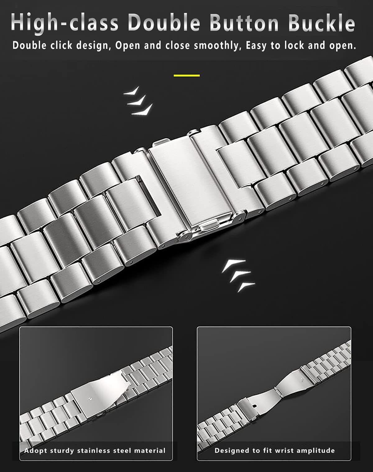 Q: What materials are used in this watch band?A: This watch band is crafted from high-quality solid stainless steel, which is durable, allergy-free, and designed for comfort. It features a fine polish that resists fading even when exposed to moisture.