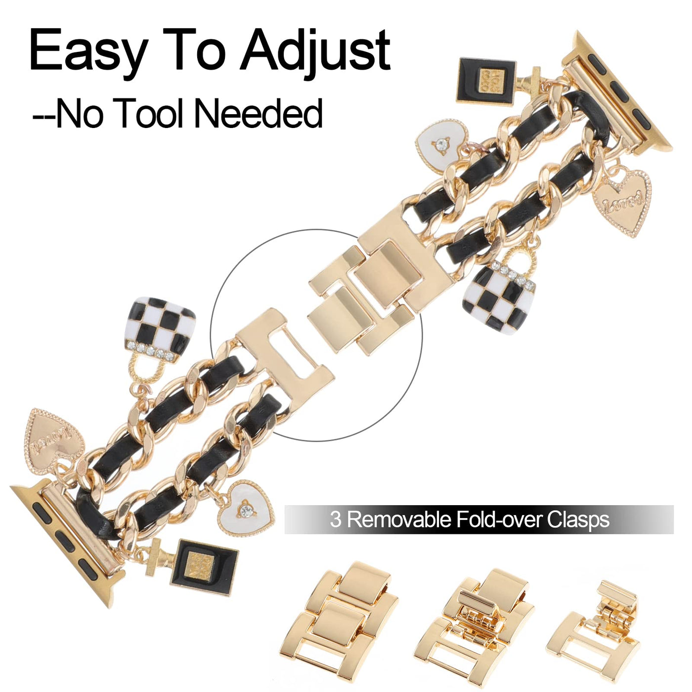 Specifications: Replacement For Apple Watch Band Material: Metal,Leather Product Style:Stylish Color:Golden Watch Band Quantities Of Pendants On The Golden Chain: 2 Heart Shaped Pendants With A Diamond In The Middle 2 Cute Mini Charms Bag Pendants With Diamonds 2 Heart Shaped Pendants With Carved 'Loved' On It 2 Mini Perfume Bottle Pendants Product Size:165Mm(Length)X20Mm(Width) (6.5 *0.79 ) Package Size: 265Mm(Length)X70Mm(Width) (10.43 *2.76 ) Compatible Models: Compatible With Apple Watch 38Mm 40Mm 41Mm Compatible With Apple Watch 42Mm 44Mm 45Mm Compatible With Apple Watch Series 9,Series 8,Series 7,Series 6,Series 5 Compatible With Apple Watch Series 4, Series 3,Series 2,Series 1 Compatible With Apple Watch Ultra 49Mm Compatible With Apple Watch Se What'S In The Box? 1 X Metal Watch Band(Watch Not Included) About Realsign: 1.We Sell Various Types Of Watch Bands,Charms Watch Band Accessories. We Sell Watch Straps Made Of Various Materials, Items With Novel And Unique Styles. 2.All Our Products Are Of High Quality, And We Provide Good Pre-Sales And After-Sales Services. 3.If You Have Any Questions Or Concerns About The Product You Received,Please Contact Us By Email And We Will Provide You With A Solution As Soon As Possible.