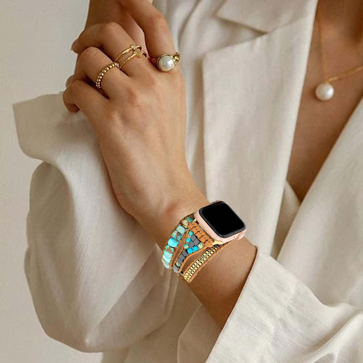 Somesame Compatible With Apple Watch Band 42Mm 44Mm 45Mm 46Mm 49Mm Women Boho Beaded Bracelets,Multilayer 3 Wraps Natural Turquoise Stone Handmade Strap For Iwatch Series 10 9 8 7 6 5 4 3 2 Se Ultra