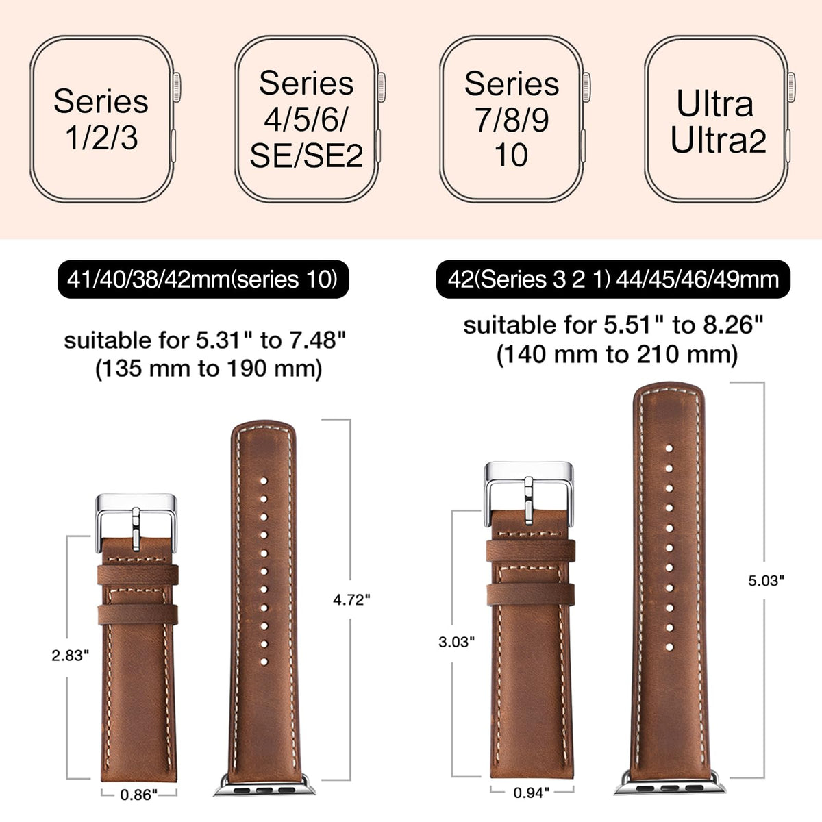 Q: What Apple Watch models are compatible with the SUNFWR Leather Bands?A: The SUNFWR Leather Bands are compatible with Apple Watch models 42mm (Series 3, 2, 1), 44mm, 45mm, 46mm, and 49mm, including Ultra 2, Ultra, SE2, SE, and Series 10, 9, 8, 7, 6, 5, 4, 3, 2, and 1.