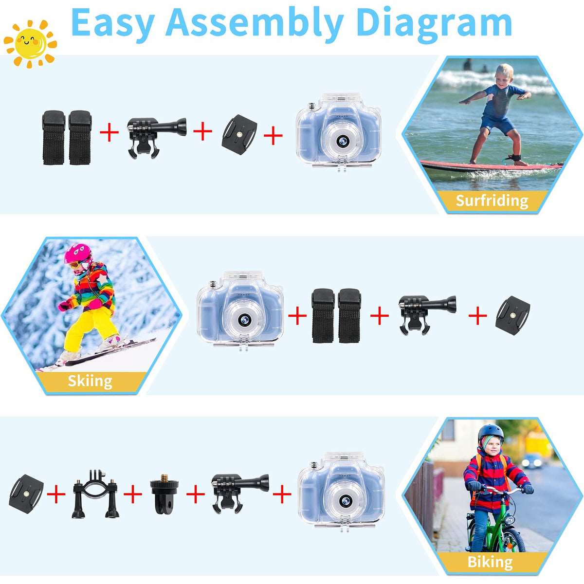 Why Choose Our Kids Camera? Kids Waterproof Camera, Underwater Digital Video Action Cameras With 32Gb Micro Sd Card And Card Reader. Perfect Gift: Our Kids Camera Is A Perfect Gift Choose For 3-12 Years Old Boys Girls, It Is Very Suitable For Birthday, Halloween, Thanksgiving, Christmas, New Year, Holidays. Multi-Functional: Underwater Kids Camera With Funny 15 Frames, 6 Different Filters, 5 Puzzle Games, Satisfy Children'S Fun, Photo Capture, Video Recording, Timed Photo, Bursting, You Can Take Perfect Photos At Any Time To Record The Beautiful Life Of Children. Best Accessories: Digital Kids Camera With Many Practical Accessories, Such As: Waterproof Case, Bicycle Stand, Adapter, Helmet Mount, Helmet Base, Helmet Bandage, It Is Really A Good Ideal For Outdoor Activities. Package Include: 1* Kids Camera 1* Waterproof Case 1* Bicycle Stand 1*Adapter 1*Helmet Mount 1*Helmet Base 2*Helmet Bandage 1*Usb Cable 1*32Gb Sd Card 1*Card Reader 1*Manual 1* Lanyard