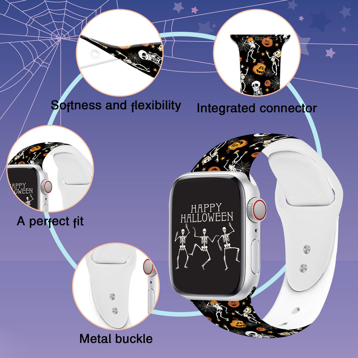High-Performance Soft Silicone: Soft Fluoroelastomer Silicone Provides Soft Cushioning On Your Wrist And Prevents Skin From Irritation Well. Fadeless Holiday Pattern Printed Soft Silicone Bands: Fadeless Cute Skulls Funny Skeleton Pattern Watch Band Great Halloween, Christmas, Thanksgiving, New Year, And Birthday Gifts For Friends Or Family. Easy Installation And Remove: The Halloween Sport Bands For Apple Watch Come With Watch Lugs On Both Ends, Which Lock Onto The Watch Interface Precisely And Securely. Geekism Excellent Quality: Our Halloween Watch Bands With Superior Soft Silicone, Smooth Surface, Sports Appearance, Sweat-Resistant, Dirt-Proof, Waterproof, Lightweight And Durable, Provide A Comfortable And Gentle Feeling For Your Wrist.