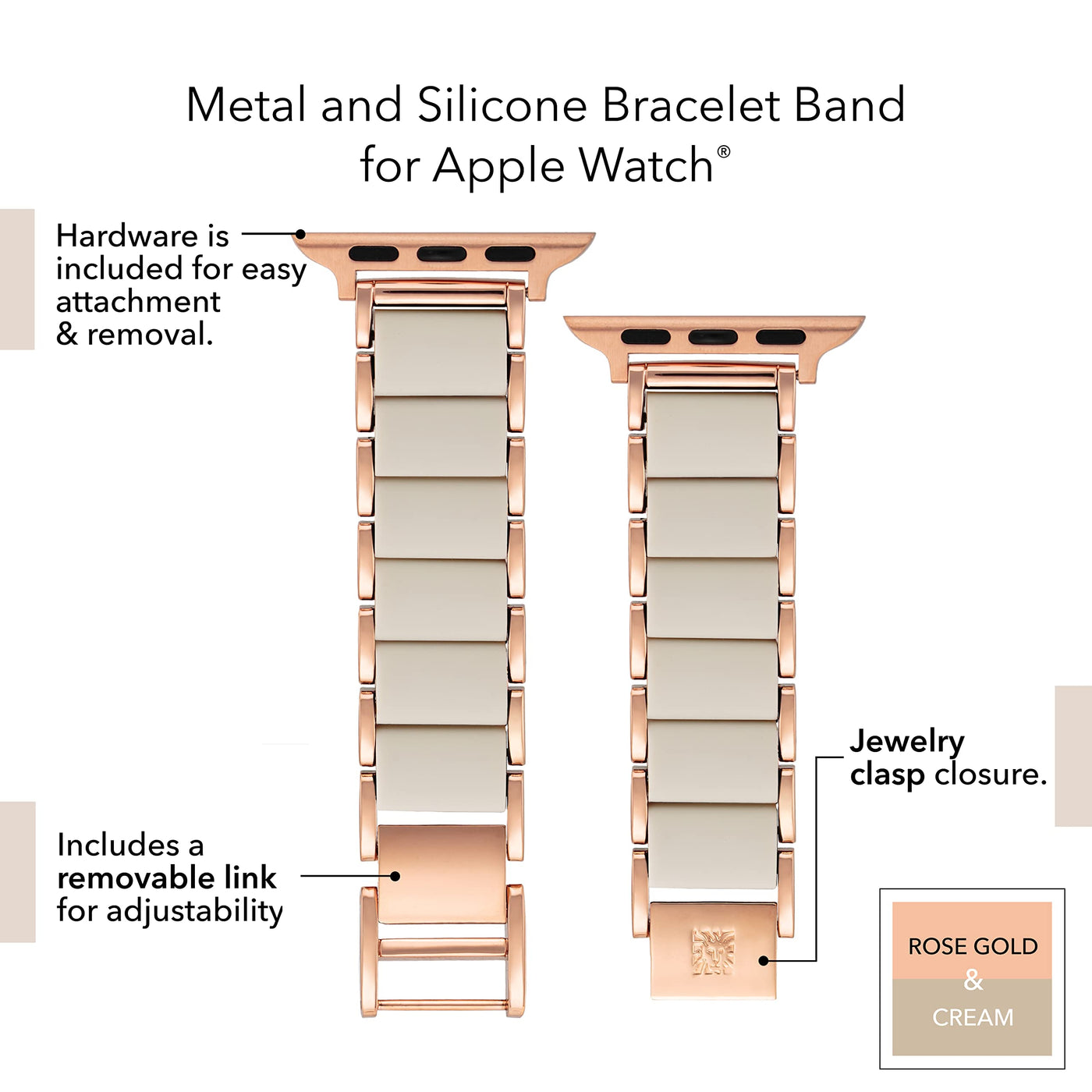 This Apple Watch Band Is A High-Quality Option That Is As Functional As It Is Stylish. Made Of Metal Links With A Durable, Rose Gold-Tone Finish And Matte Cream Rubberized Center Links, Its A Wonderful Complement To Your Existing Wearable Device. Compatible With 38Mm, 40Mm And 41Mm Apple Watches. Please Note That The Apple Watch Device Is Not Included; Bands Are Sold Individually.
