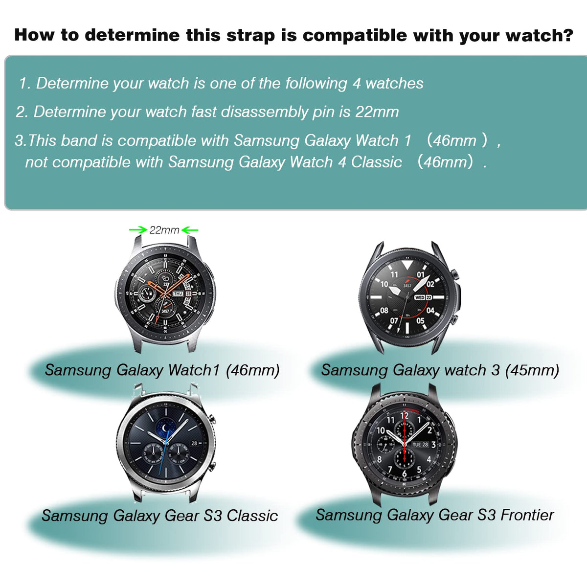 Q: Which Samsung watch models are compatible with the HSWAI bands?A: The HSWAI bands are compatible with the Samsung Galaxy Watch 3 (45mm), Galaxy Watch (46mm), and Galaxy Gear S3 Classic and Frontier models. Please note that they are not compatible with Galaxy Watch Active 2, Galaxy Watch 3 (41mm), Galaxy Watch 4 (40mm/44mm), or Galaxy Watch 4 Classic (42mm/46mm).