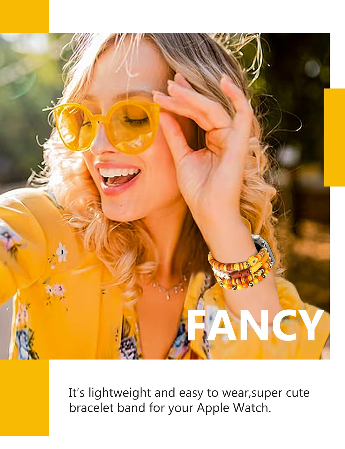 Q: What materials are used in the JR.DM Beaded Bracelet?A: The JR.DM Beaded Bracelet is made from colorful non-fading polymer clay beads, which are flexible and durable. This material provides a comfortable wearing experience while adding a stylish touch to your Apple Watch.