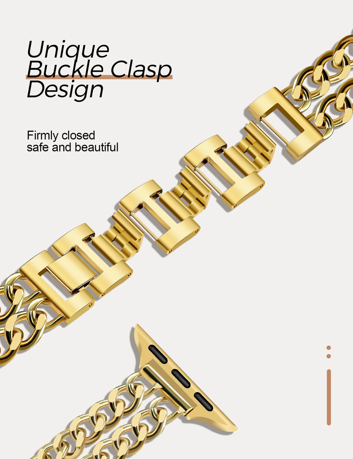 High Quality And Durable: This Iwatch Band Is Made Of Premium Metal Alloy And Well-Polished By Hand. Vacuum Electroplating The Whole Watch Band Makes It Durable And Keeps The Color Lasting Longer. | Elegant And Stylish: The Metal Watch Band Is Made With A Fashion Double Chain Design, Which Gives Your Outfit A Western Cowboy-Style, Elegant And Fashion Look. It Perfectly Fits Any Outfits, Casual, Dressy, Business Looks, Etc.. For Work, Dates, Party, Shopping, Show, Any Leisure, Or Special Occasions. | Safe And Beautiful: Made Of Unqiue Buckle Clasp Design, The Band Is Firmly Closed And Fit Your Wrist Well, More Beautiful And Safety. The Watch Band Is Also Easy To Wear And Take Off With The Buckle Clasps. | Adjustable Length And Easy Removing Links: We Add 3 More Detachable Clasps To Extend The Band Length. You Can Easily Adjust The Length By Hand Even Without Tools. It Is Very Convenient And Easy To Work With. It Fit Wrist Size: 5.4''-7'' (137 Mm-188 Mm) | Compatible With All Apple Watch Models: This Fashion Watch Band Pairs With All Apple Watch Series 10/9/8/7/6/5/4/3/2/1/Se/Ultra. The Watch Connector Comes In 2 Sizes - 38Mm/40Mm/41Mm/42Mm(Series 10) And 42Mm(Series 1/2/3)/44Mm/45Mm/46Mm/49Mm. Warm Tips-No Cover Included, Only Watch Band