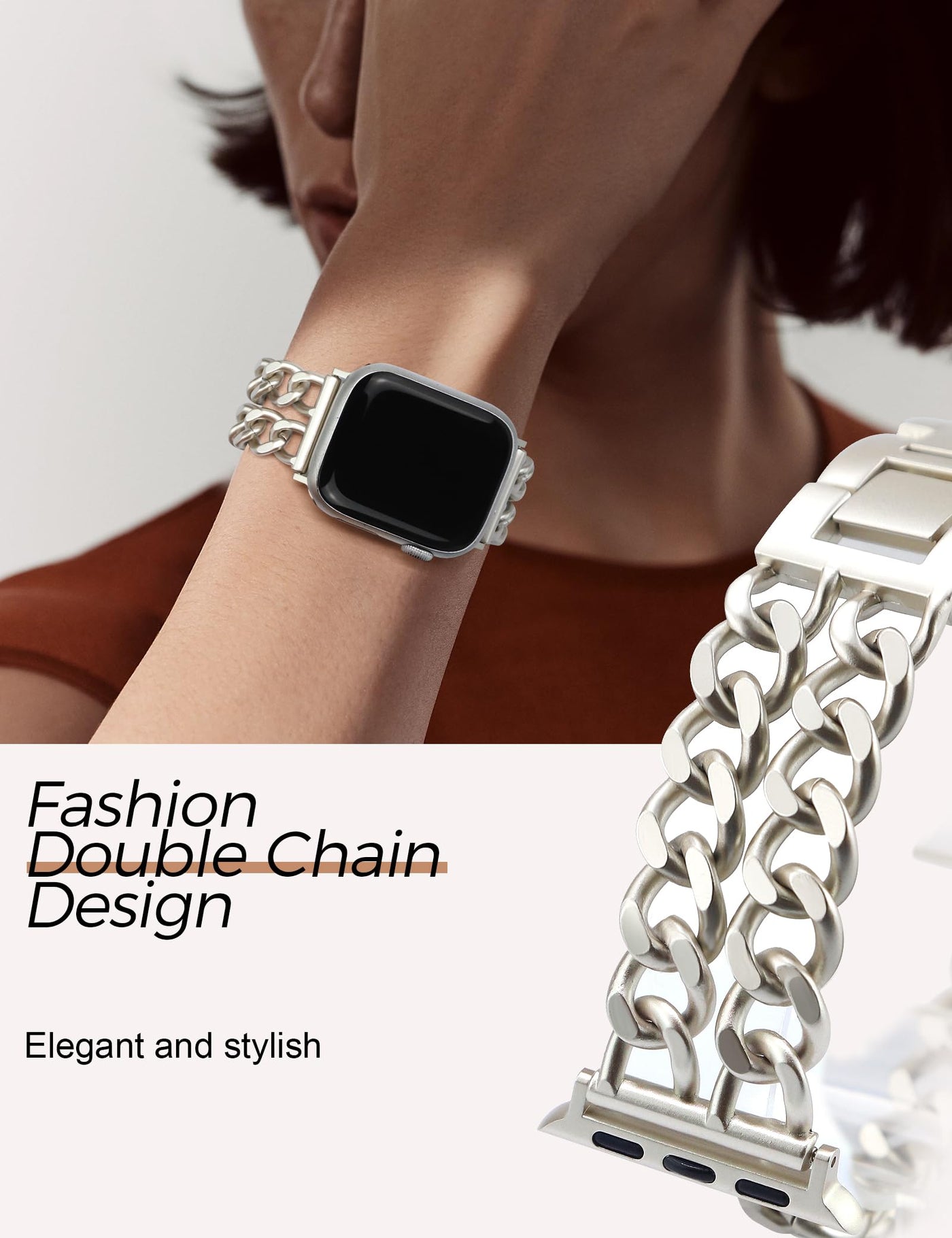 High Quality And Durable: This Iwatch Band Is Made Of Premium Metal Alloy And Well-Polished By Hand. Vacuum Electroplating The Whole Watch Band Makes It Durable And Keeps The Color Lasting Longer. | Elegant And Stylish: The Metal Watch Band Is Made With A Fashion Double Chain Design, Which Gives Your Outfit A Western Cowboy-Style, Elegant And Fashion Look. It Perfectly Fits Any Outfits, Casual, Dressy, Business Looks, Etc.. For Work, Dates, Party, Shopping, Show, Any Leisure, Or Special Occasions. | Safe And Beautiful: Made Of Unqiue Buckle Clasp Design, The Band Is Firmly Closed And Fit Your Wrist Well, More Beautiful And Safety. The Watch Band Is Also Easy To Wear And Take Off With The Buckle Clasps. | Adjustable Length And Easy Removing Links: We Add 3 More Detachable Clasps To Extend The Band Length. You Can Easily Adjust The Length By Hand Even Without Tools. It Is Very Convenient And Easy To Work With. It Fit Wrist Size: 5.4''-7'' (137 Mm-188 Mm) | Compatible With All Apple Watch Models: This Fashion Watch Band Pairs With All Apple Watch Series 10/9/8/7/6/5/4/3/2/1/Se/Ultra. The Watch Connector Comes In 2 Sizes - 38Mm/40Mm/41Mm/42Mm(Series 10) And 42Mm(Series 1/2/3)/44Mm/45Mm/46Mm/49Mm. Warm Tips-No Cover Included, Only Watch Band