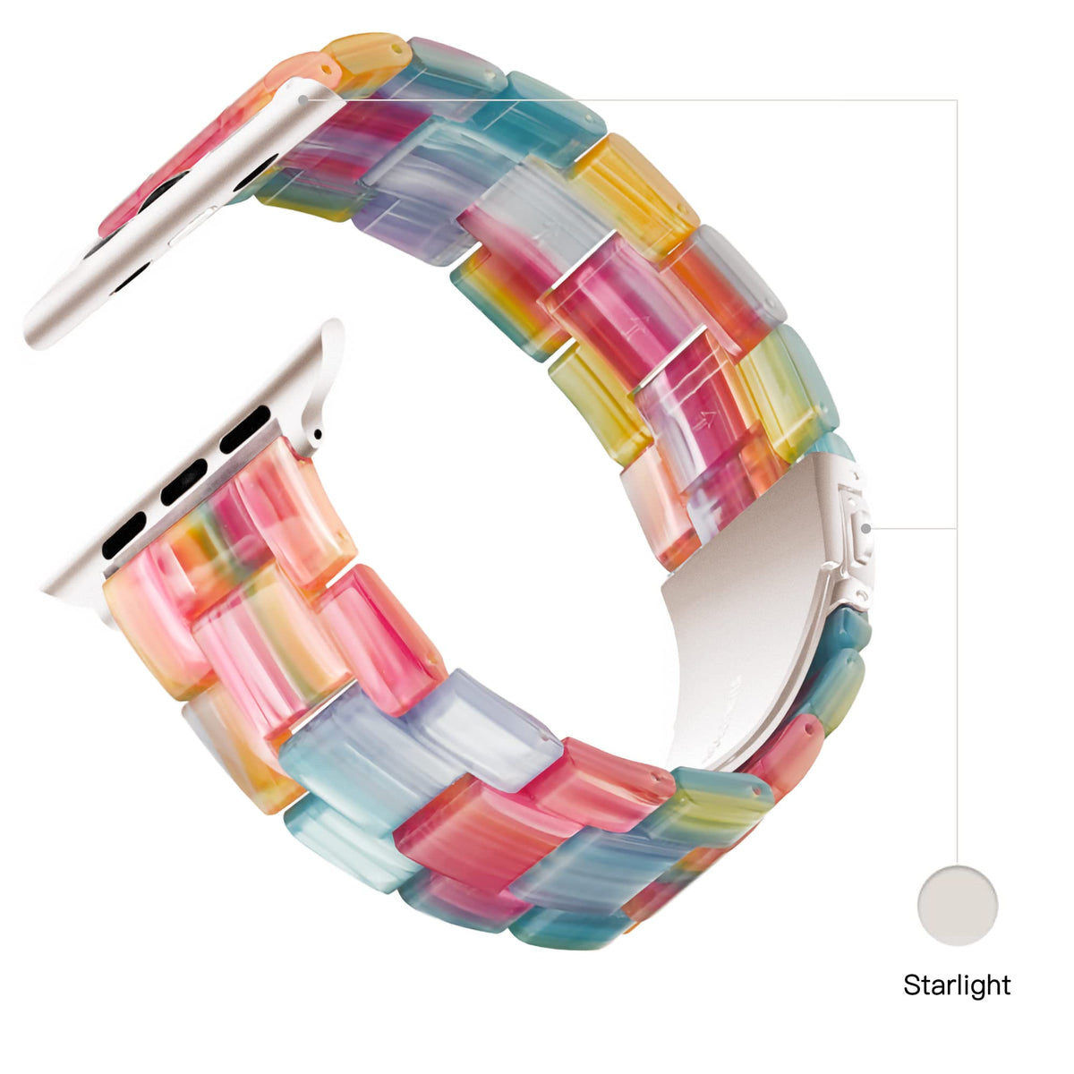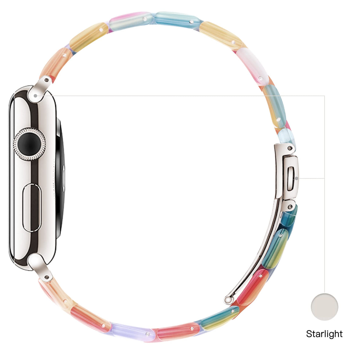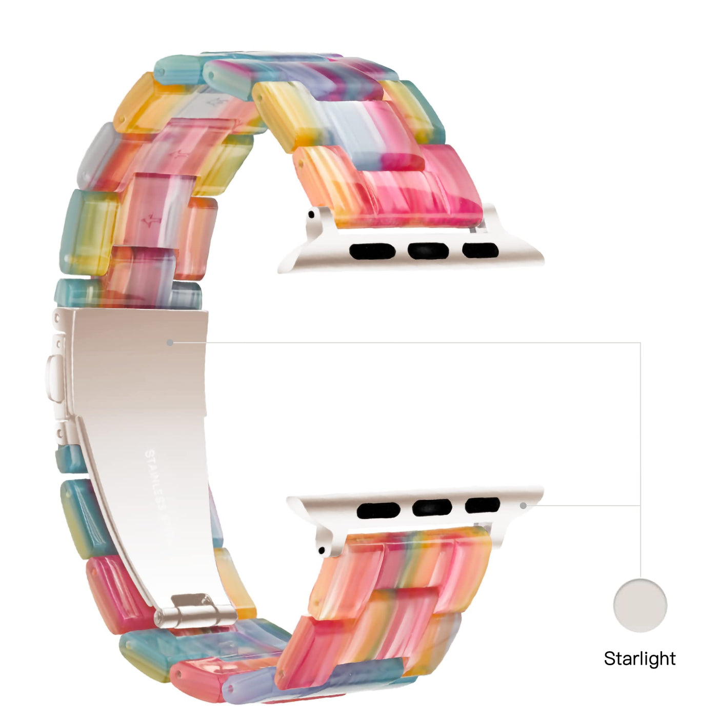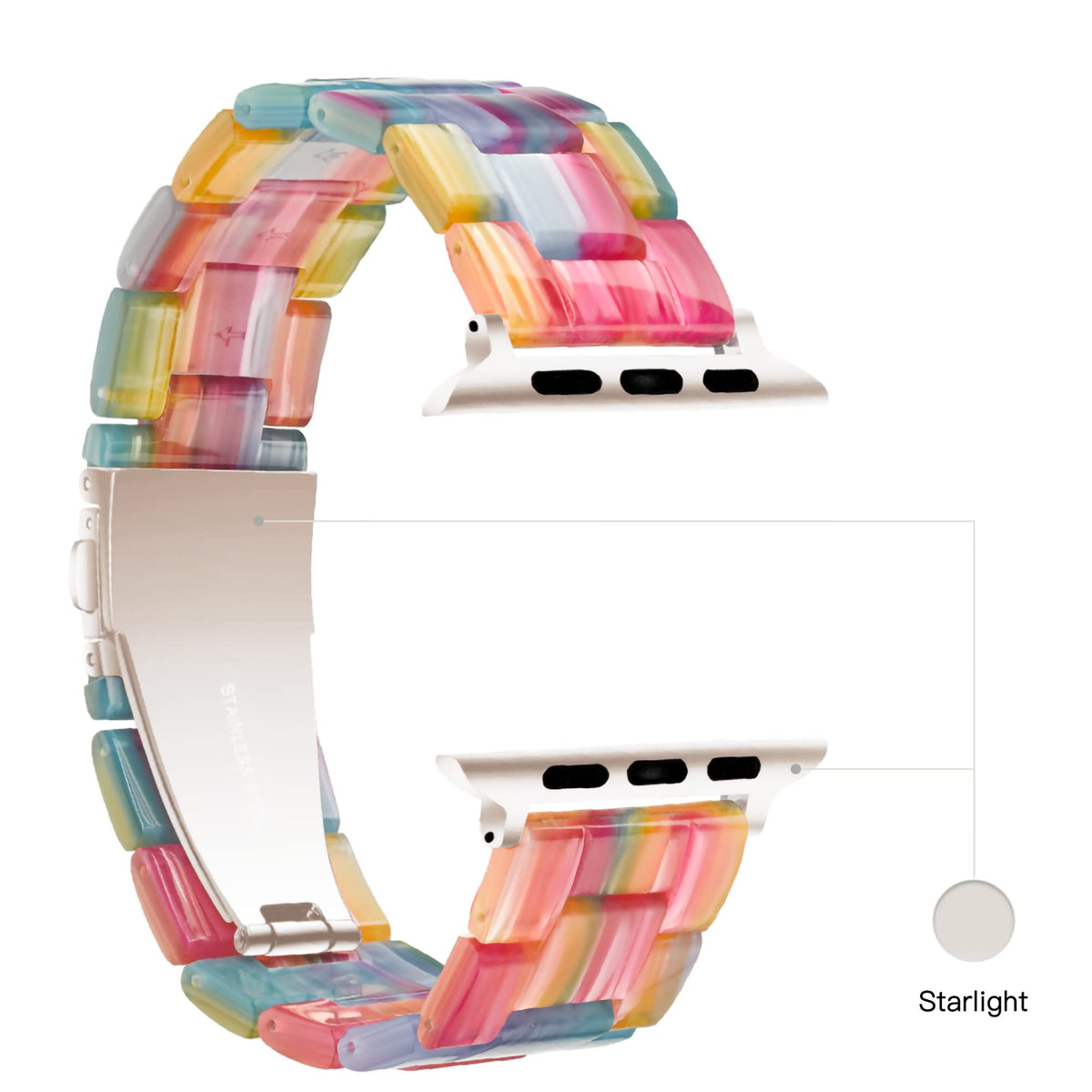 Q: What materials are used in the Light Apple Watch Band?A: The Light Apple Watch Band is made from premium tortoise-tone resin and features a stainless steel buckle. This combination ensures durability while providing a stylish and comfortable wearing experience.