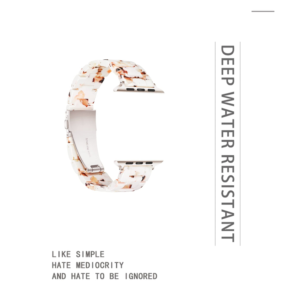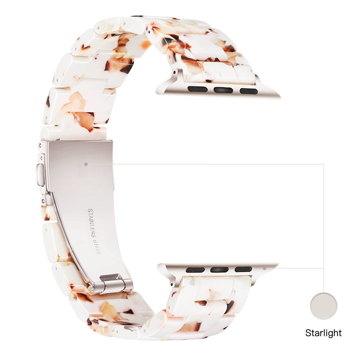 Q: What materials are used in the Light Apple Watch Band?A: This watch band is made from premium tortoise-tone resin combined with a stainless steel buckle, ensuring both durability and a stylish appearance.