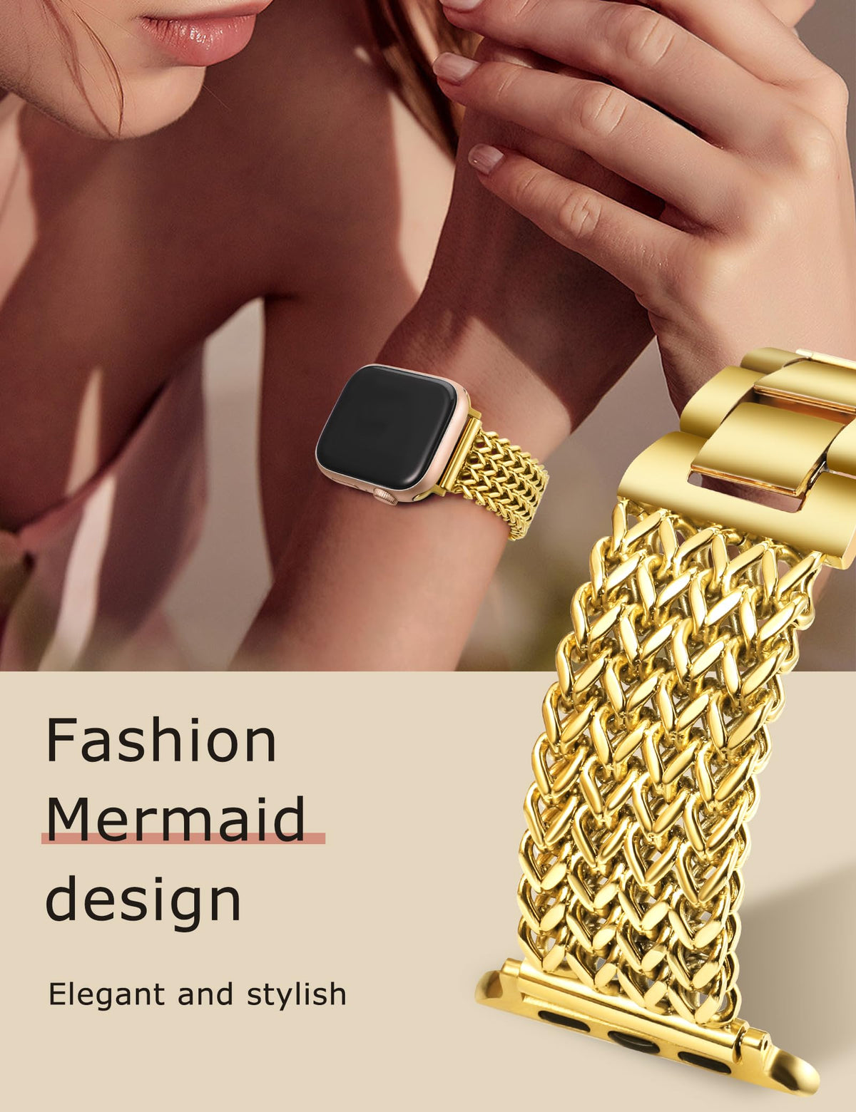 Minyee Compatible With Apple Watch Band 41/40/38/44/45/49/42Mm Women, Dressy Stainless Steel Metal Gold Chain Strap Mermaid Desi