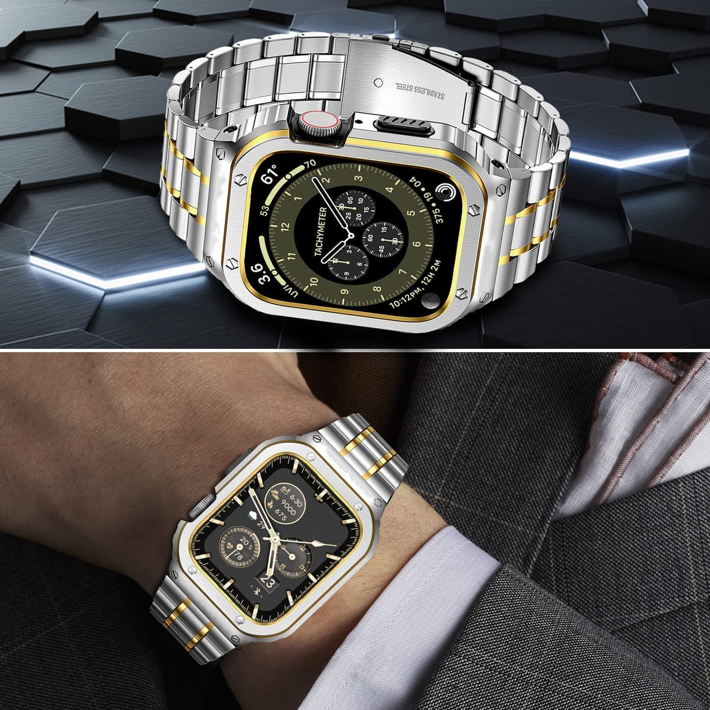 ?Compatibility?This Case/Band Compatible Apple Watch Series 9/8/7(45Mm),The Watch Band Is Suitable For Wrist Size 6.5''-8.8'', And The Replacement Band Can Be Shortened Or Extended Using The Included Link Removal Tool To Fit Your Wrist Perfectly.Only Chains Marked With Arrows Are Removable. Please Follow The Correct Steps To Remove The Band To Avoid Damage.(Apple Watch Not Included) | ?Metal Case Protection?The One-Piece Band With Case Is Made Of High-Quality 316 Steel, Which Is Strong, Shock-Proof And Drop-Proof. Enhanced Comfort And Durability, This Band Is Skin-Friendly And Delicate. With A Delicate Steel Connector, It Won'T Let Your Watch Fall Off Easily. The Stainless Steel Metal Case Bumper And Tpu Bumper Lock Your Watch Precisely And Securely, Protecting Your Iwatch From Scratches. | ?Charging Directly?Iwatch Frame Protection Design (Without Bottom Cover), It Is Convenient For You To Charge Directly Without Disassembling The Case, Suitable For Any Charging Device. Precise Hole Design For Easy Access To All Buttons. | ?Classic And Fashionable Design?The Design Is Inspired By World-Renowned Brands, Gradually Showing Slim And Ultra-Thin Styles. The Exquisite Appearance Is A Fashion Trend That Is Popular All Over The World. The Band Is 2.5Mm Thick And Has A Net Weight Of 0.9 Lbs. Bringing You A Sense Of Sophistication. Provides A Comfortable Fit For Any Indoor And Outdoor Activity. | ?Exllent Customer Service?Replacement Or Full Refund For Anything Unsatisfied In 30 Days.Your Valuable Suggestions On Our Bands Are Invaluable Asset For Us To Improve Our Products.If You Have Any Questions About The Product, Please Feel Free To Contact Us.
