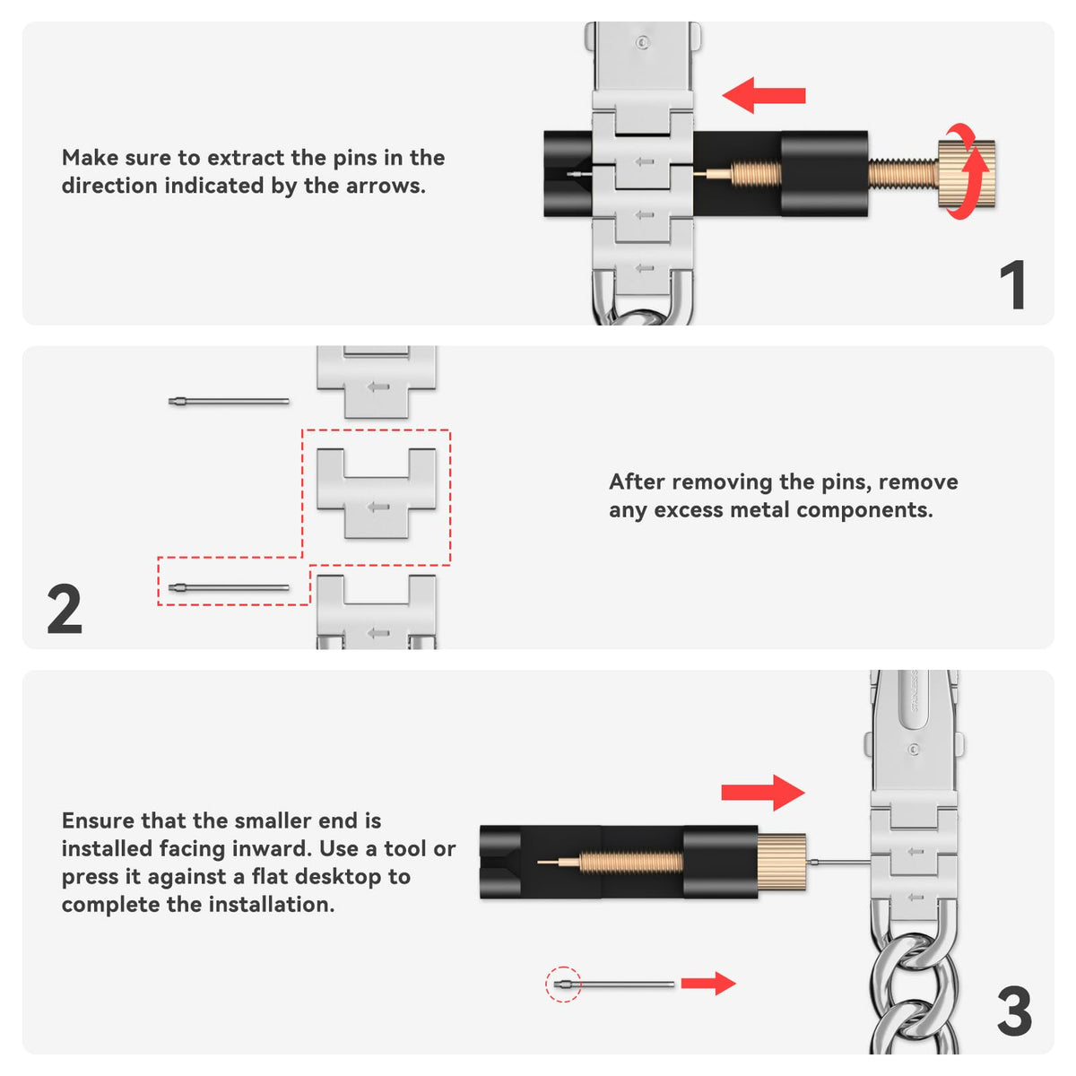 Q: How do I adjust the size of the watch band?A: The watch band features an adjustable size mechanism. It can fit wrist sizes ranging from 5.6" to 9". You will receive six removable chains along with the necessary adjustment tools to help you easily customize the fit.