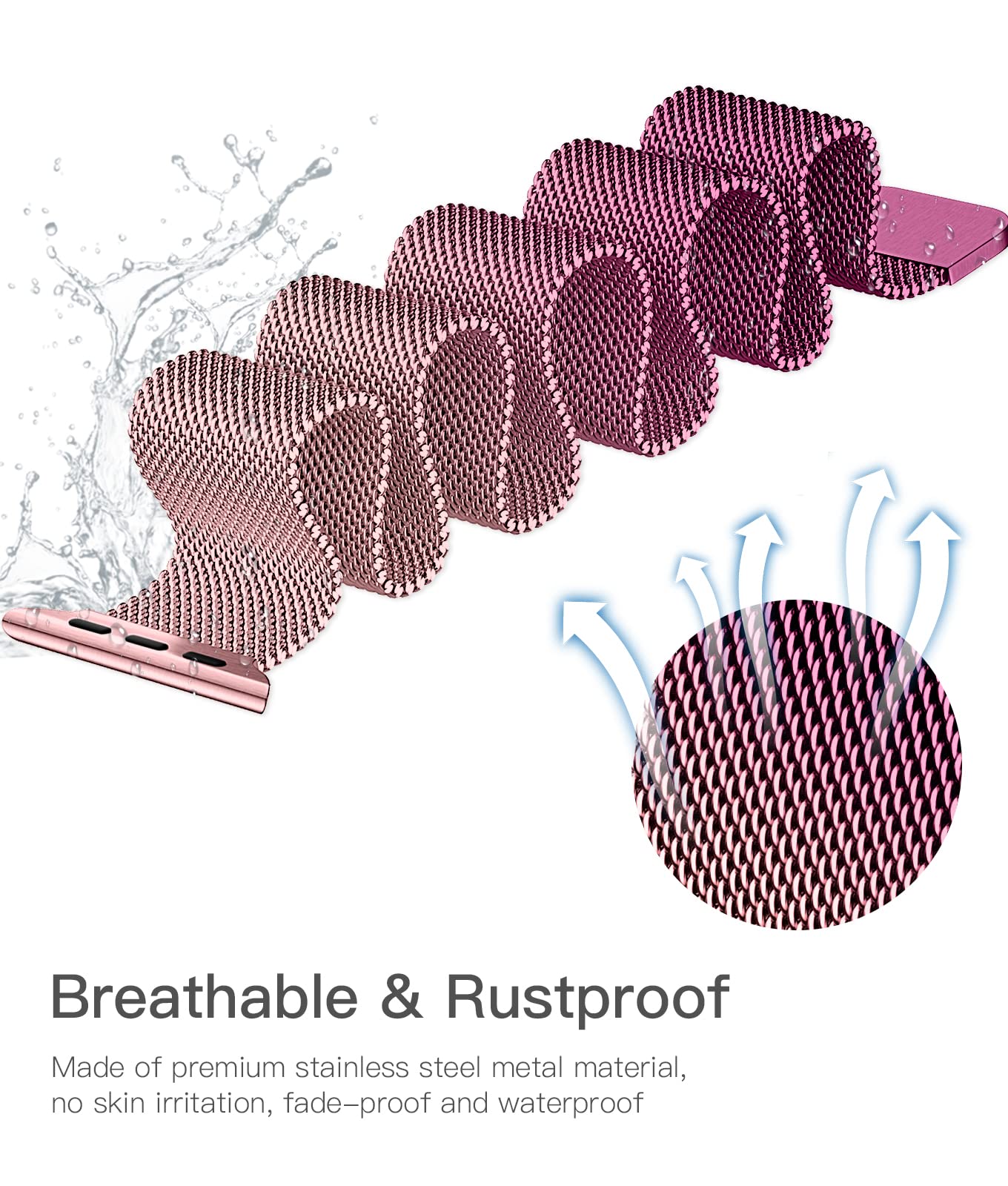 Q: Is the Rabini Apple Watch band waterproof and rustproof?A: Yes, the Rabini stainless steel mesh band is designed to be waterproof and rustproof. It is made from premium stainless steel metal, making it suitable for daily wear and outdoor activities such as running and swimming.