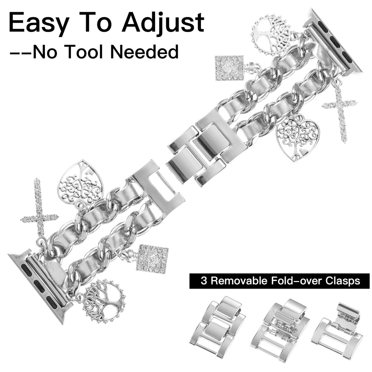 Specifications: Replacement Band For Apple Watch Band Material: Metal,Leather Product Style:Stylish,Distinctive Color:Silver Watch Band Quantities Of Pendants On The Silver Chain: 2 Love Shape Tree Of Life Pendants 2 Round Shape Tree Of Life Pendants 2 Cross With Diamond Pendants 2 Mini Lovely Perfume Bottles Pendants Watch Band Net Weight:About 58.85G(2.08Oz) Watch Band Size:About 165Mm(Length)X20Mm(Width) (6.5 *0.79 ) Package Size: About 228Mm(Length)X70Mm(Width) (8.98 *2.76 ) Compatible Models: Please Choose Size ''38/40/41Mm'' For The Following Series: Compatible With Apple Watch Series 1/2/3 38Mm(2015/2016/2017) Compatible With Apple Watch Series 4/5/6 40Mm(2018/2019/2020) Compatible With Apple Watch Series 7/8/9 41Mm(2021/2022/2023) Compatible With Apple Watch Se 40Mm (2020/2022) Please Choose Size ''42/44/45Mm'' For The Following Series: Compatible With Apple Watch Series 1/2/3 42Mm(2015/2016/2017) Compatible With Apple Watch Series 4/5/6 44Mm(2018/2019/2020) Compatible With Apple Watch Series 7/8/9 45Mm(2021/2022) Compatible With Apple Watch Se 44Mm (2020/2022) Compatible With Apple Watch Ultra,Ultra 2 49Mm (2022/2023) (Please Check The Size On The Back Of Your Watch To Choose The Right Size.) What'S In The Box? 1 X Metal Watch Band(Watch Not Included) About Realsign: 1.We Sell Various Types Of Watch Bands,Watch Band Charms Accessories.We Sell Watch Straps Made Of Various Materials,Items With Original And Stylish Styles. 2.All Our Products Use Premium Materials,Have Good Quality And Are Well Packaged,We Provide Good Pre-Sales And After-Sales Services. 3.If You Have Any Questions About Our Products,Please Contact Us By Email And We Will Provide You With A Solution As Soon As Possible.