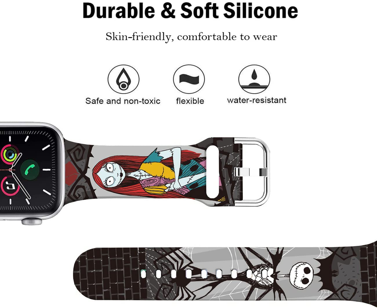 [ Compatible Model]: Sjiangqiao Halloween Bands Designed For Apple Watch Series Se/Se2 9 8 7 6 5 4 3 2 1. [How To Choose The Size]: The Apple Watch Band Sally/Jack Skellington Replacement Is Suitable For Iwatch 45Mm/44Mm/41Mm Width. 38Mm/40Mm/41Mm Is Suitable For 7.0 - 8.0 Inch Wrist; 42Mm/44Mm/45Mm Is Suitable For 6.8 - 8.8 Inch Wrist. Please Measure Your Wrist Or Ask Our Customer Service Before Order. [The Material]: Made Of High Quality Soft Silicone, Skin Friendly And Durable. Sweat And Water Resistant Design Helps You Feel Comfortable To Wear It. [ Design]: Cartoon Print Not Be Faded. Classic Rose Gold Buckle Clasp Brings You A More Comfortable Wearing Experience. This Band With Watch Lugs On Both Ends For Secure Lock And Seamless Connection, Easy To Installand Remove. [ Functio]: A Cool Watch Band Replacement. Personalize Your For Apple Watch To Match Your Mood And Outfit, Showing Your Unique And Stylish. [Great Gift Idea]: Suitable For Men And Women Daily Use. It'S Also A Great Gift Idea For Your Love, Family And Friends During Birthday, Wedding, Holiday, Christmas, New Year, Etc.