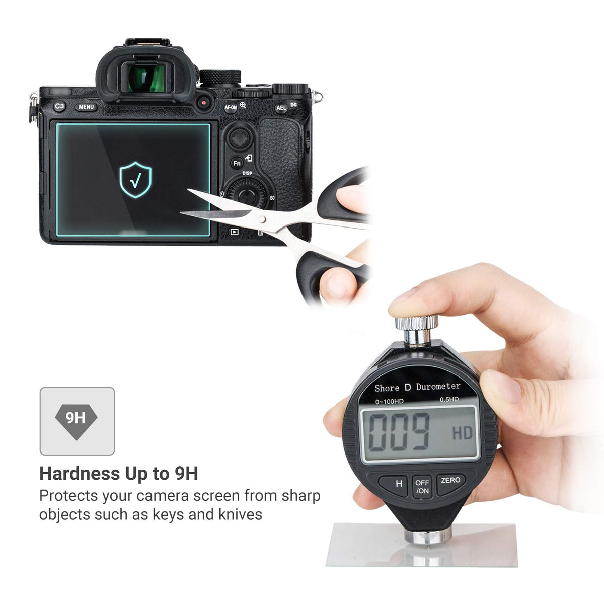 Q: What features make this screen protector effective against scratches?A: The JJC screen protector has a hardness index of 9H, which means it is highly resistant to scratches from sharp objects such as keys and knives. Additionally, it is made from optical glass that offers multiple layers of protection against dirt and light impacts.