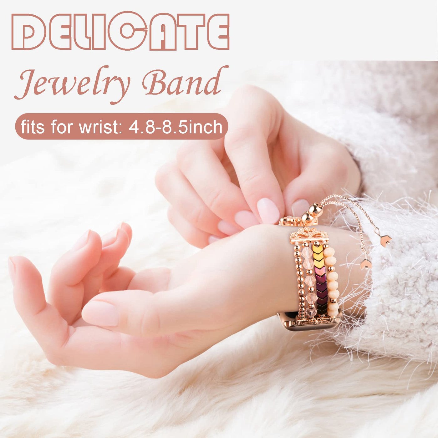 Q: What wrist sizes does the Fohuas Beaded Bracelet Band fit?A: The Fohuas Beaded Bracelet Band is adjustable and fits most female wrists, recommended for sizes between 5" to 7.5". You can easily resize it by sliding the chain balls up and down for a comfortable fit.