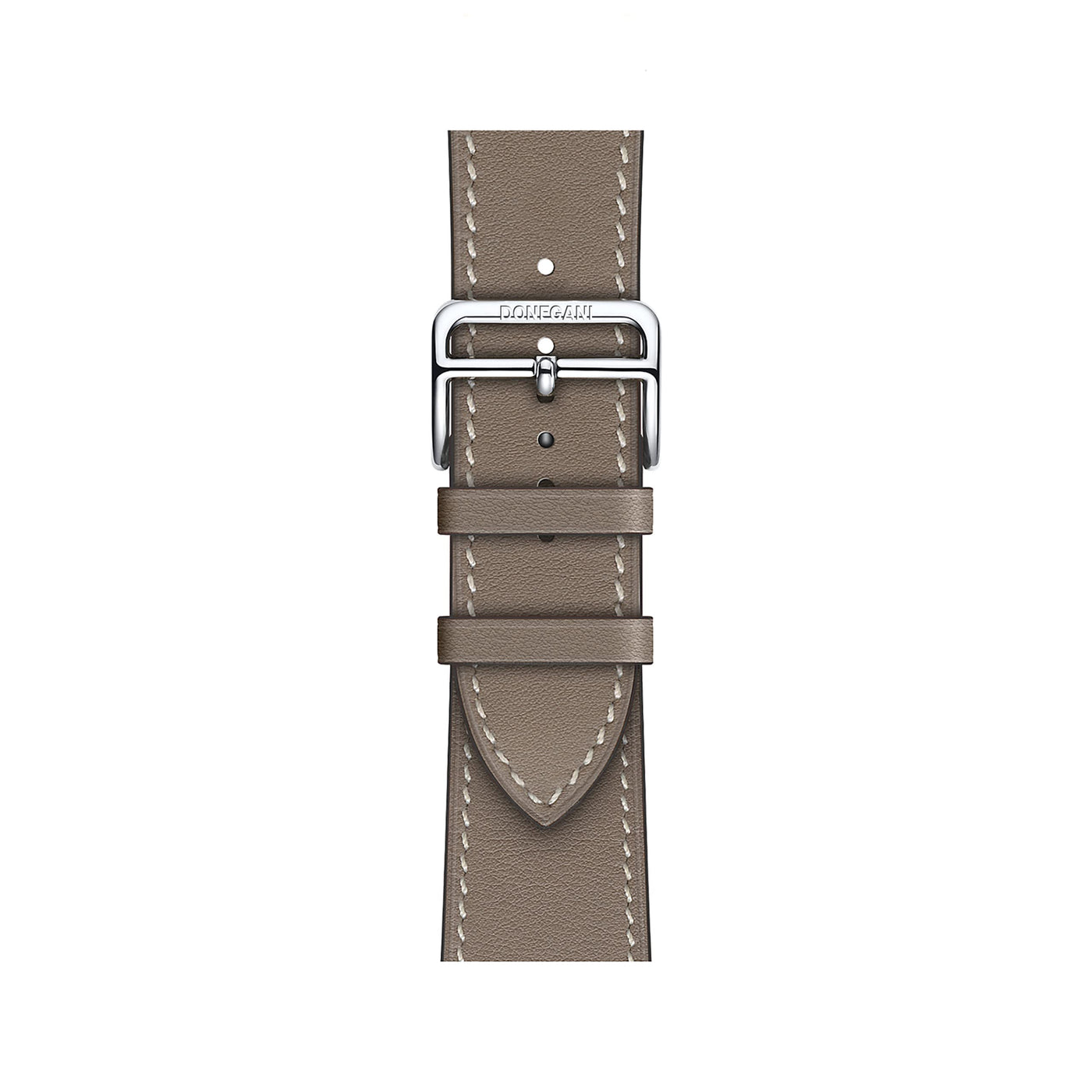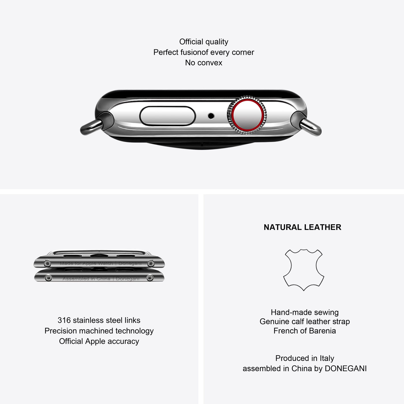 Q: What materials are used in the DONEGANI LB1 Leather Band?A: The band is made from genuine calf leather produced in Italy, with connections and closures crafted from 316 stainless steel, ensuring durability and a perfect fit with the Apple Watch.