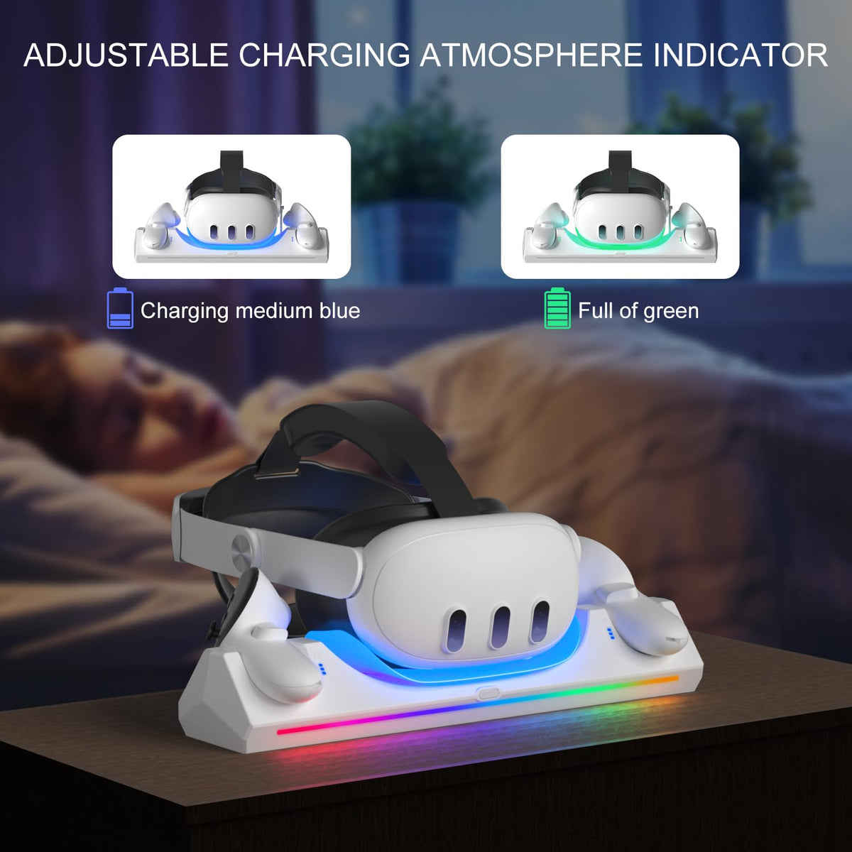 Fast Charging: We Designed And Optimized The Battery Of Charging Station To Power Up The Upgraded Performance Of Meta Quest 3/Quest 3S, Equipped With 30W Charging Adapter, The Headset Takes 2.5 Hours To Fully Charged And The Controllers Within 4 Hours. | Strong Magnetic Attraction: The Magnetic Design Can Charge The Quest 3 Headset And Touch Controllers Simultaneously. Place Your Vr Headset And Controllers On The Charging Station To Charge, Makes Placing Meta Quest 3 Accessories More Easier. | Safe And Stable Charging Performance: The Quest 3 Charging Dock Has Micro Intelligent Circuit Management Technology, Automatically And Effectively Repair Batteries, Also Passed Safety Certifications And Equipped With Various Safety Protection Systems. | Save Money: The Quest 3 Charging Station Includes 2 X 1800Mah Rechargeable Batteries And Custom Covers That Can Be Used More Than 500 Times, Which Avoid Replace Battery More Frequently. Reusable Batteries Can Save Your Money. | All-In-One Set: You Will Get 1 X Charging Dock, 1 X 30W Pd Adapter, 1 X Type-C Cable, 2 X Rechargeable Batteries, 4 X Magnetic Usb-C Connectors, 1 X User Manual.